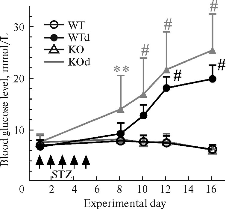 Рис. 1. Динамика изменения уровня глюкозы в крови у мышей исследуемых групп. WT – дикий тип (без диабета), Panx 1 KO – нокаут гена паннексина 1 (без диабета), WTd, KOd – соответствующие группы мышей с экспериментальным диабетом. WT n = 7, WTd n = 9, КО n = 18, КОd n = 15. Данные представлены в виде средних ± стандартное отклонение. Трехфакторный ДА, апостериорный тест Шидака, различия достоверны: ** – p < 0.01, # – p < 0.0001 (по сравнению с той же группой в 1-й день эксперимента).