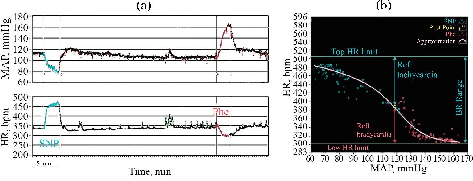 В качестве индекса чувствительности барорецепторной реакции (ИЧБРР) использовали максимальное значение производной регрессионной кривой БРР. Используя регрессионную кривую, также рассчитывали диапазон барорефлекторной реакции (АБРР) как разницу между ЧССmax и ЧССmin. Определяли ЧСС покоя как среднее значение ЧСС за 1 мин, наблюдаемое за 1 мин до введения вазоактивных соединений. Также рассчитывали величину рефлекторной тахикардии (ТКБРР) и брадикардии (БКБРР) как разность между ЧССmax или ЧССmin и ЧСС покоя.