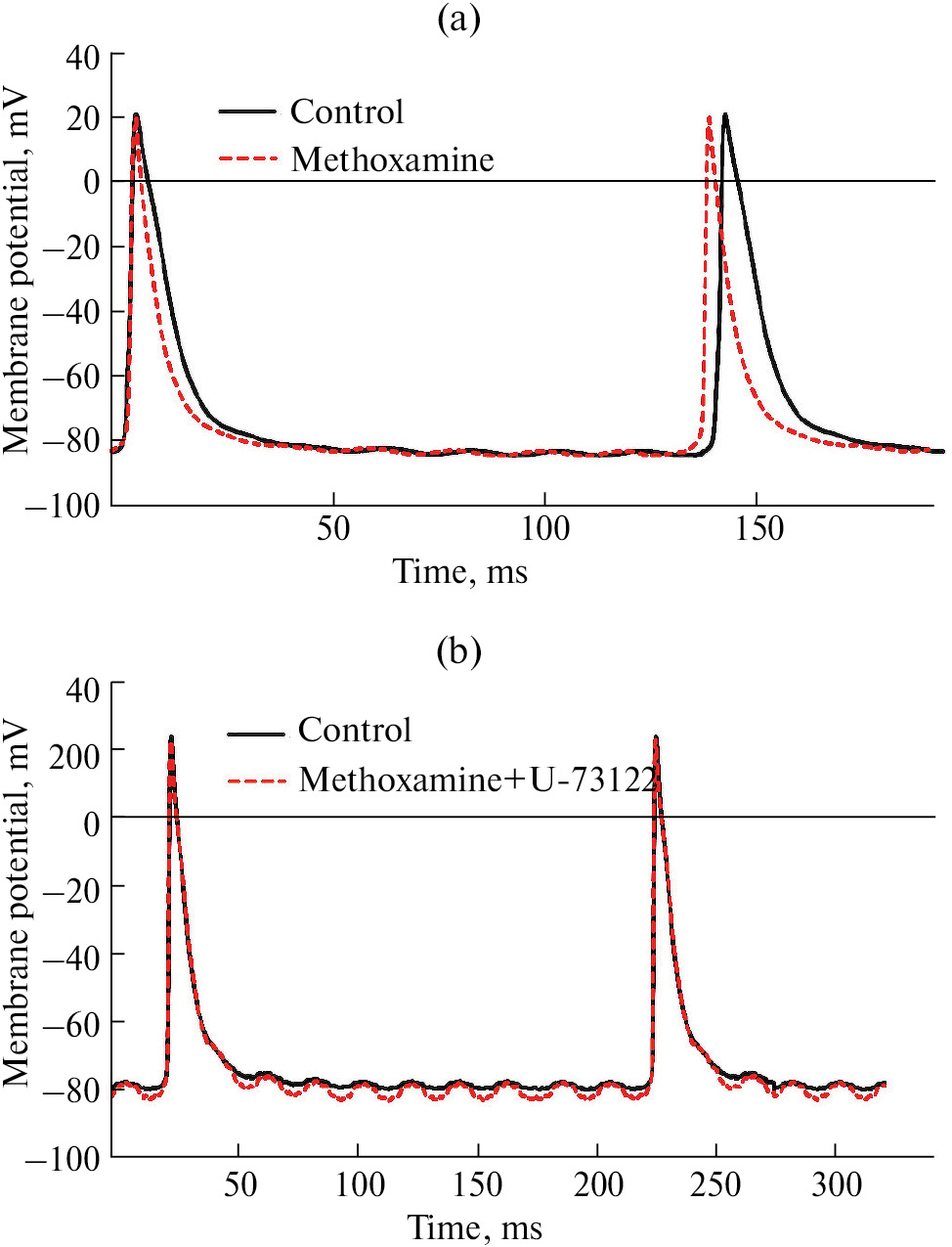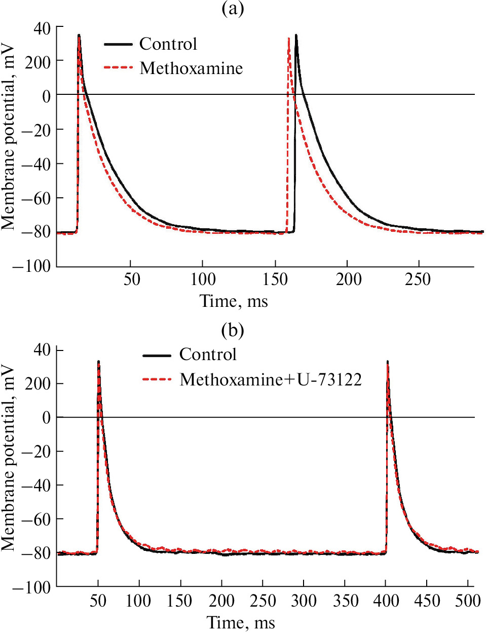 Рис. 5. Оригинальные записи электрической активности, демонстрирующие изменения конфигурации ПД в рабочем миокарде правого предсердия 100-дневных крыс с сохраненным синусовым узлом и спонтанной активностью при стимуляции метоксамином (a) и на фоне блокады фосфолипазы C ингибитором U-73122 (b).