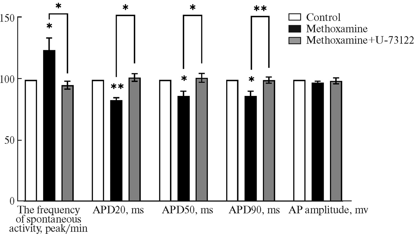 Рис. 4. Эффект (в процентах) метоксамина и метоксамина + U-73122 на амплитудно-временные параметры у 21-дневных крыс с сохраненным синусовым узлом и спонтанной активностью (* p < 0.05, ** p < 0.01).