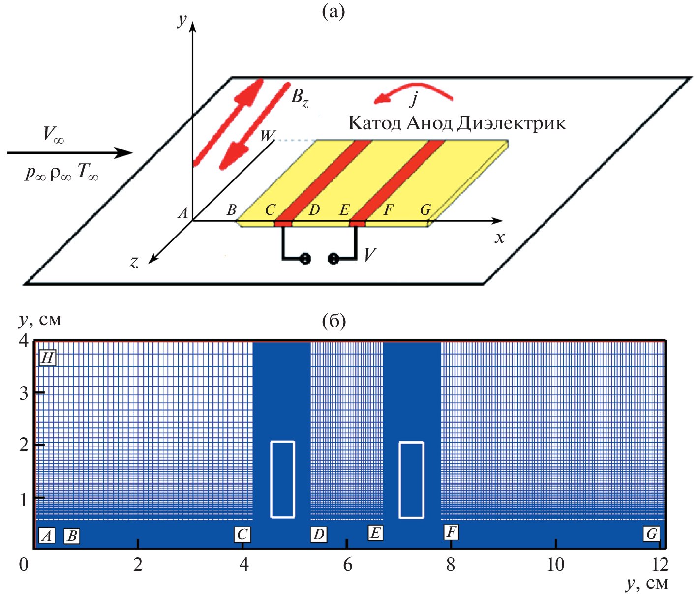 The electrodynamic structure of an anomalous glow discharge between two plane electrodes located on the surface of a sharp plate in supersonic flow of molecular nitrogen is studied numerically in a wide range of Mach numbers using a modified ambipolar model of quasi-neutral electric-discharge plasma. The ambipolar diffusion coefficient and the effective ionization rate are modified while taking into account the external magnetic field. The problem is solved in the two-dimensional x–y formulation, when the external magnetic field strength is directed in the positive or negative direction of the z axis. The parameters of anomalous glow discharge are numerically studied in the pressure range p = 0.14–5 Torr and the voltage drops on the quasineutral current column of discharge plasma V = 30–320 V. The main problem parameters which make it possible to obtain a reasonable agreement with the available experimental data are determined.