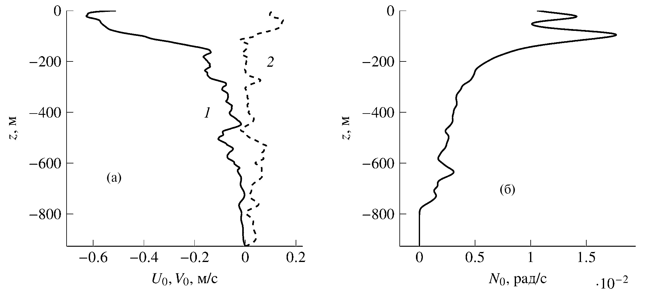 Рис. 1. Вертикальные профили (а) компонент скорости течения U0 (1), V0 (2) и (б) частоты Брента–Вяйсяля.