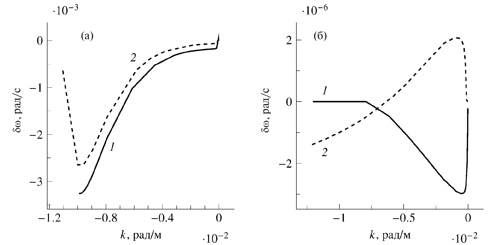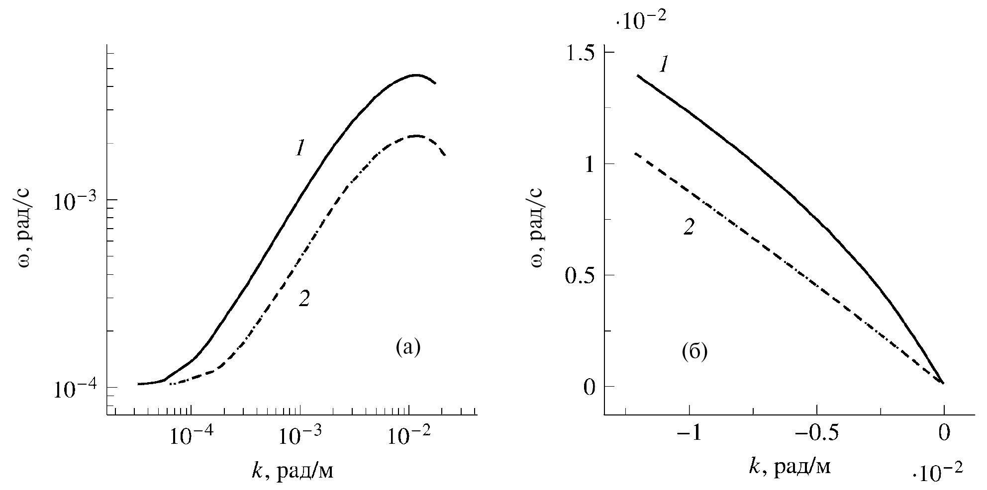Рис. 3. Дисперсионные кривые первой (1) и второй (2) мод при (а) положительных и (б) отрицательных волновых числах. Пунктиром показан результат непосредственного численного расчета.