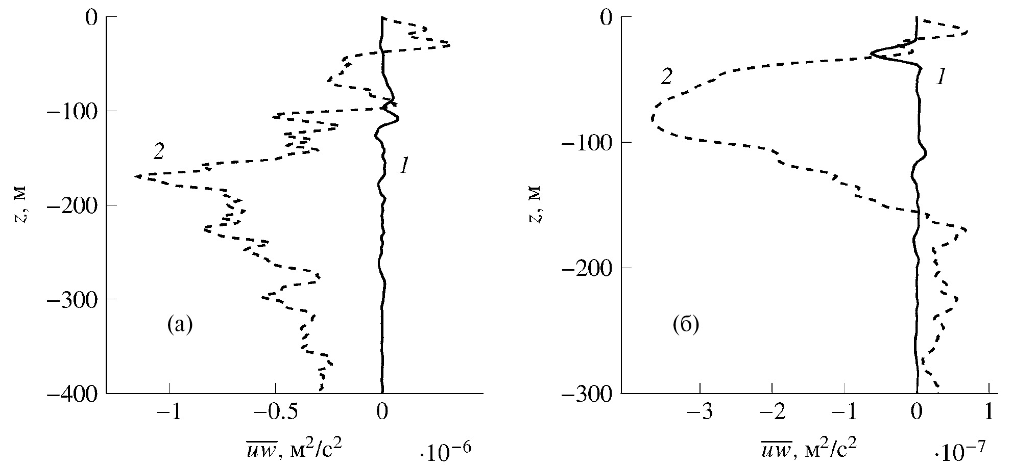 Вертикальные профили волнового uw потока импульса показаны на рис. 6а для 15-минутных внутренних волн первой моды при максимальной амплитуде волны 0.5 м. Сплошная кривая соответствует прямому прямому численному решению краевой задачи (2.5)–(2.7), штриховая соответствует методу возмущений. Метод возмущений, в сравнении с непосредственным расчетом, вновь дает превосходящие по абсолютной величине значения волновых потоков импульса. На рис. 6б показаны те же потоки для второй моды внутренних волн.
