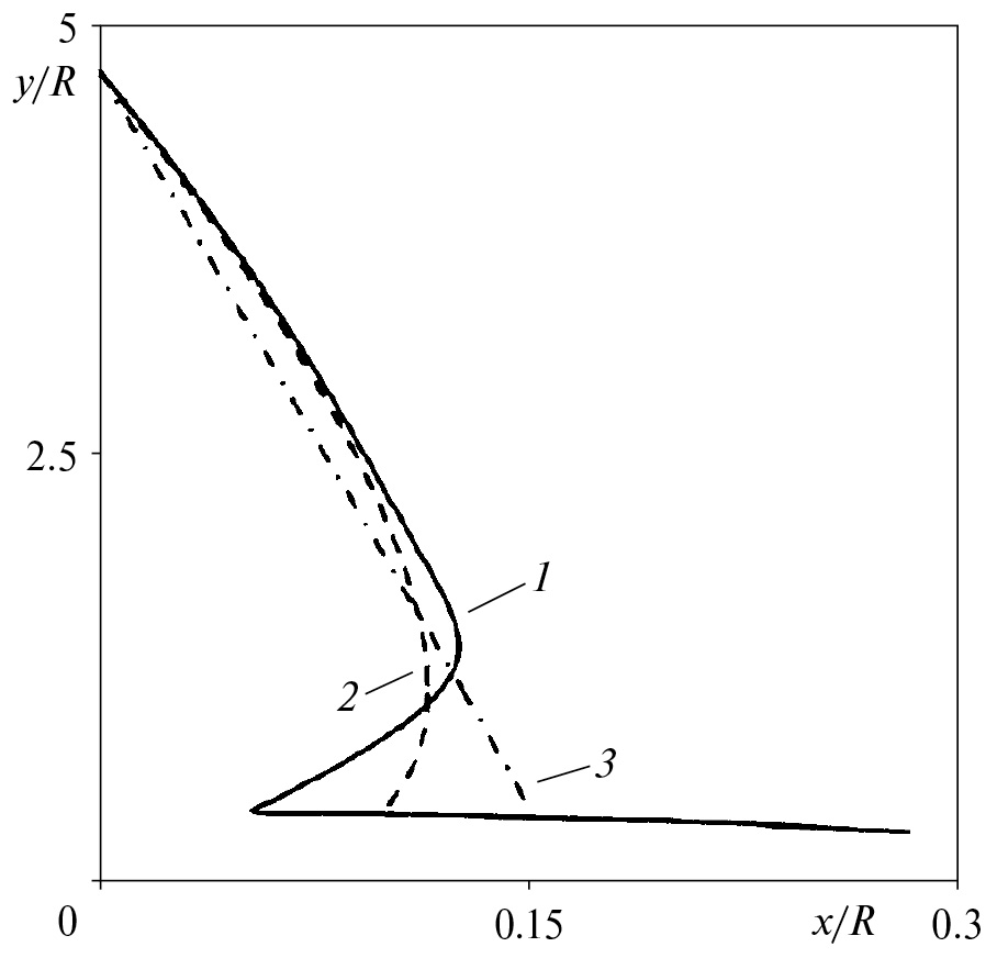 Рис. 1. Сопоставление контуров тел, φ1pl = 0.5φN: 1 — тело, построенное оптимизацией по трем параметрам; 2 — тело, построенное оптимизацией по одному параметру; 3 — звездообразное тело. с плоскими боковыми поверхностями лучей.