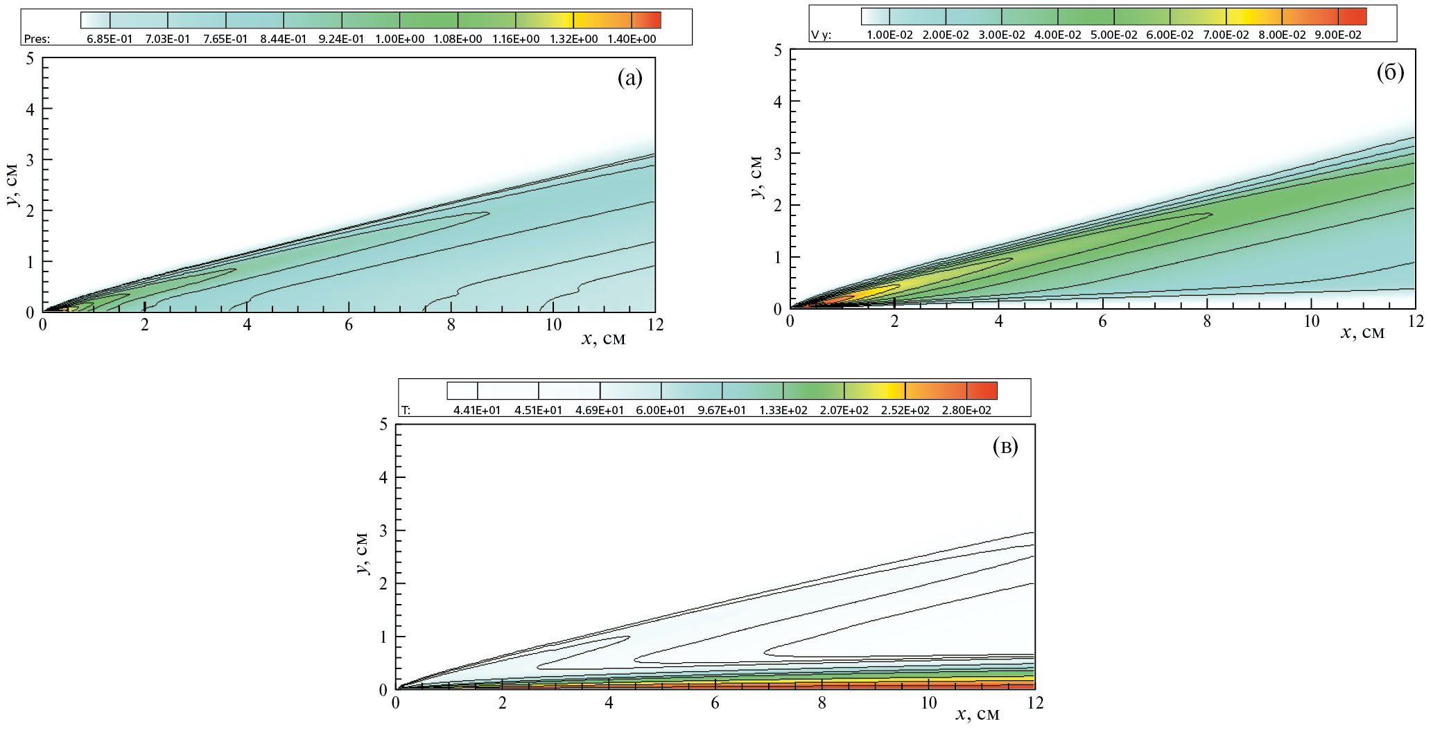 Общая картина обтекания заостренной пластины сверхзвуковым потоком при М = 5 показана на рис. 2, где показаны распределения давления (а), нормальной к поверхности компоненты скорости потока (б) и температуры (в). Для дальнейшего анализа поверхностного тлеющего разряда важными являются повышение давления вблизи электродов (их положение далее будет показано прямоугольниками на поле рисунков) и локализация температурного пограничного слоя у поверхности. Нормальная к поверхности компонента скорости является хорошим индикатором возможных возмущений в пограничном слое, в том числе за счет тлеющего разряда. В данном случае отсутствуют какие-либо видимые возмущения.