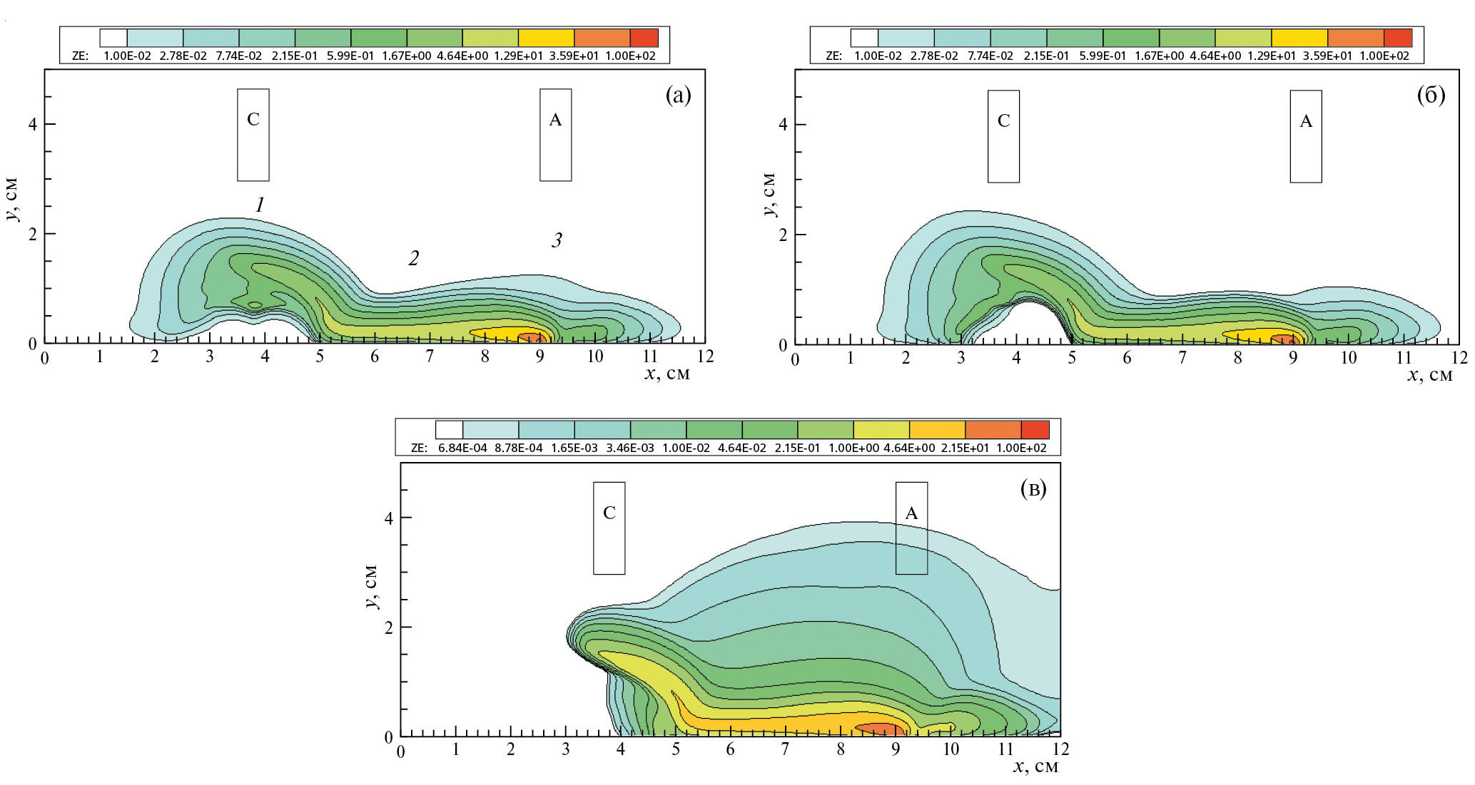 Электродинамическая структура тлеющего разряда показана на рис. 3–5. Распределение концентраций электронов (рис. 3) и ионов (рис. 4) показано без магнитного поля (а) и для двух поляризаций магнитного поля Bz = +0.01 Тл (б) и Bz = –0.01 Тл (в). Здесь и далее концентрации заряженных частиц отнесены к n0 = 109 см–3.