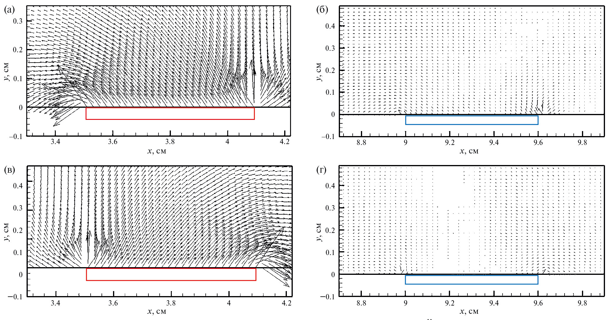 На рис. 6 показаны векторные поля напряженности электрического поля у катода (а, в) и анода (б, г) при двух поляризациях магнитного поля.