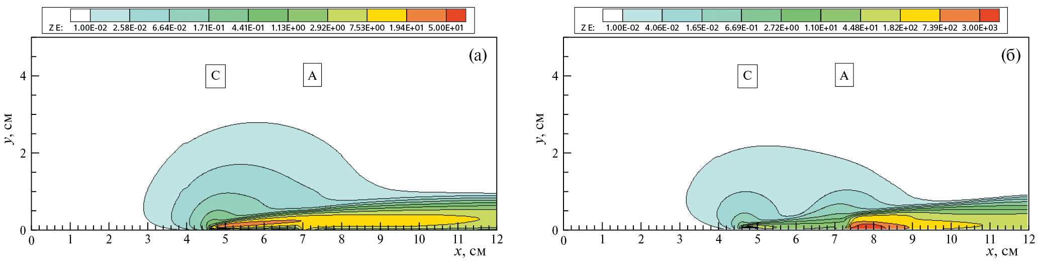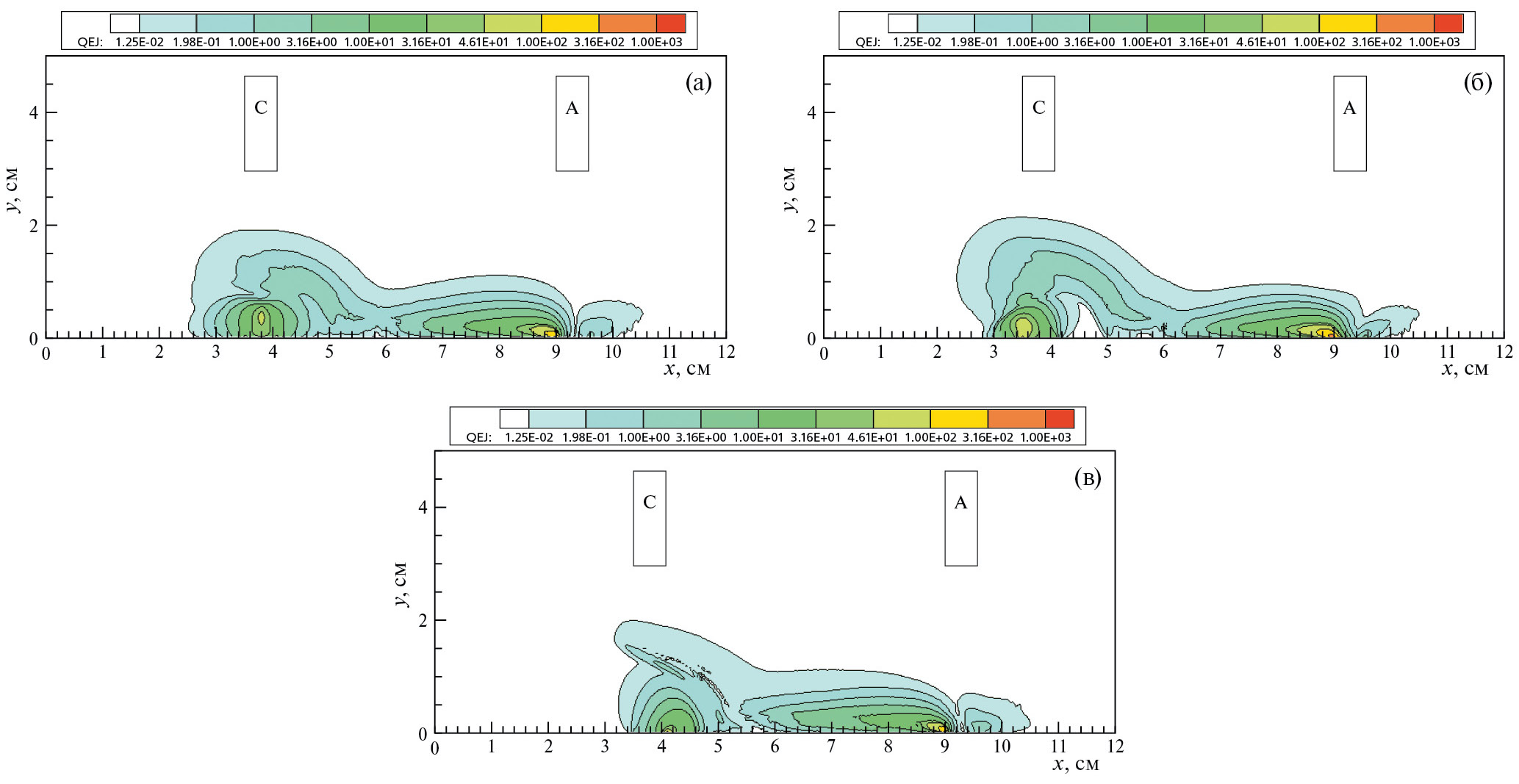 Указанные особенности иллюстрируются распределением модуля напряженности электрического поля на рис. 5. Резкое возрастание Е наблюдается особенно вблизи катода. Вблизи анода также видны локальные максимумы напряженности, но они на порядок ниже.