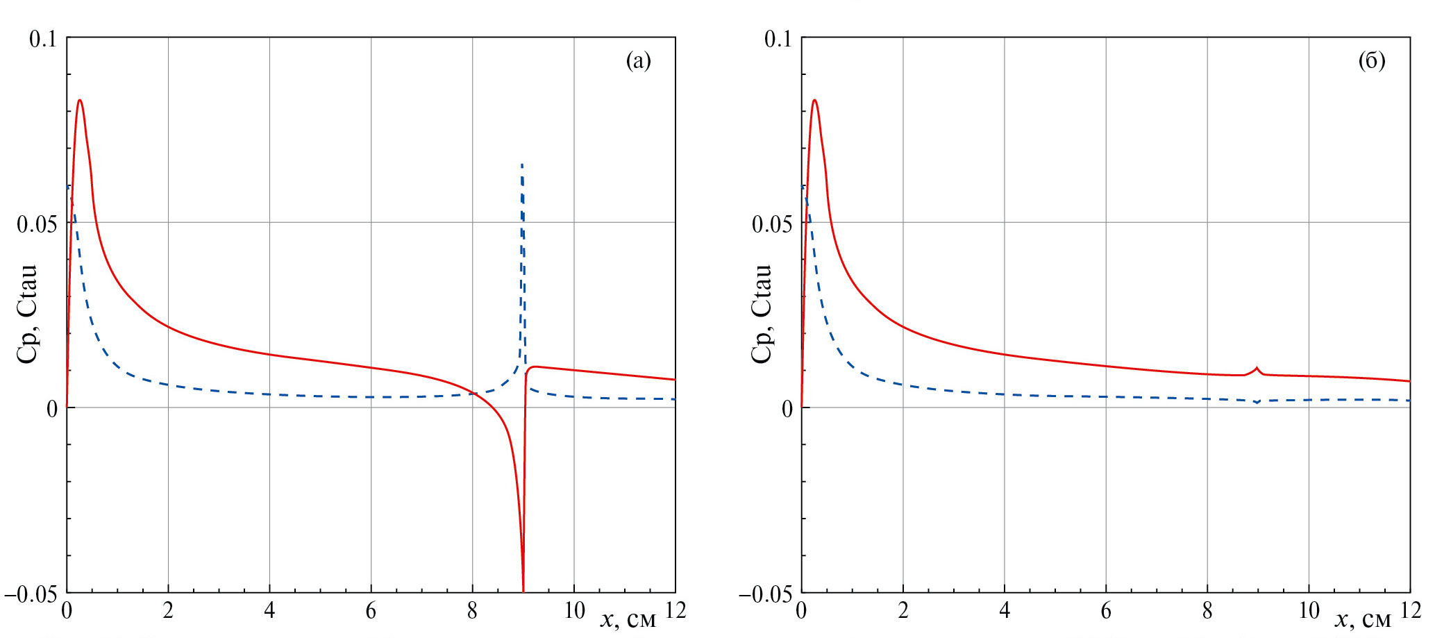 Рис. 10. Распределение коэффициентов давления (сплошная кривая) и трения при р = 0.6 Торр, M = 5, e = 1500 В; (а) Bz = +0.01 Тл, (б) Bz = –0.01 Тл.