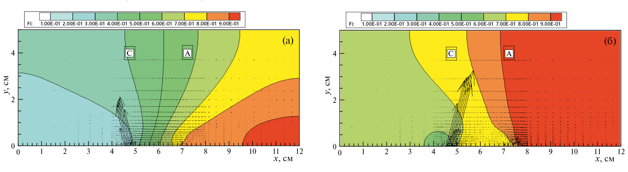 Рис. 14. Электрический потенциал (FI = j/e) в аномальном тлеющем разряде и векторное поле напряженности электрического поля при p = 5 Торр, М = 10, ε = 1000 В: Bz = +0.03 (а), Bz = –0.03 Tл (б).