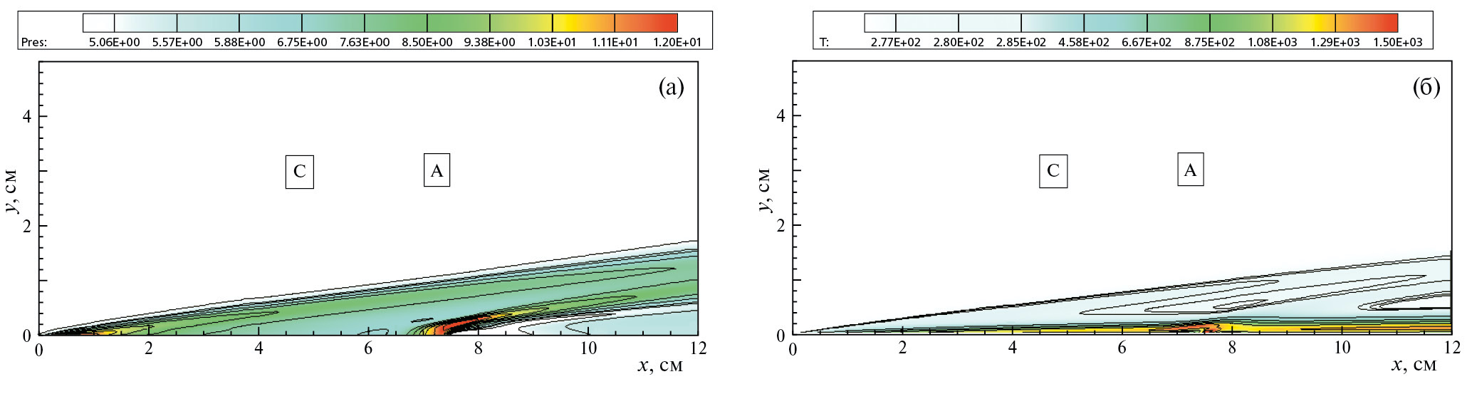 Вторая серия расчетов проводилась при увеличенном примерно на порядок давлении набегающего потока. Здесь была задана скорость потока М = 10 и температура набегающего потока T∞ = 250 К.