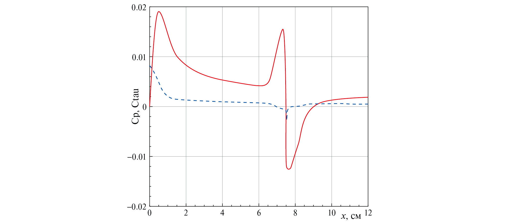 Рис. 17. Распределение коэффициентов давления (сплошная кривая) и трения при р = 5 Торр, M = 10, e = 1000 В, Bz = –0.03 Тл.