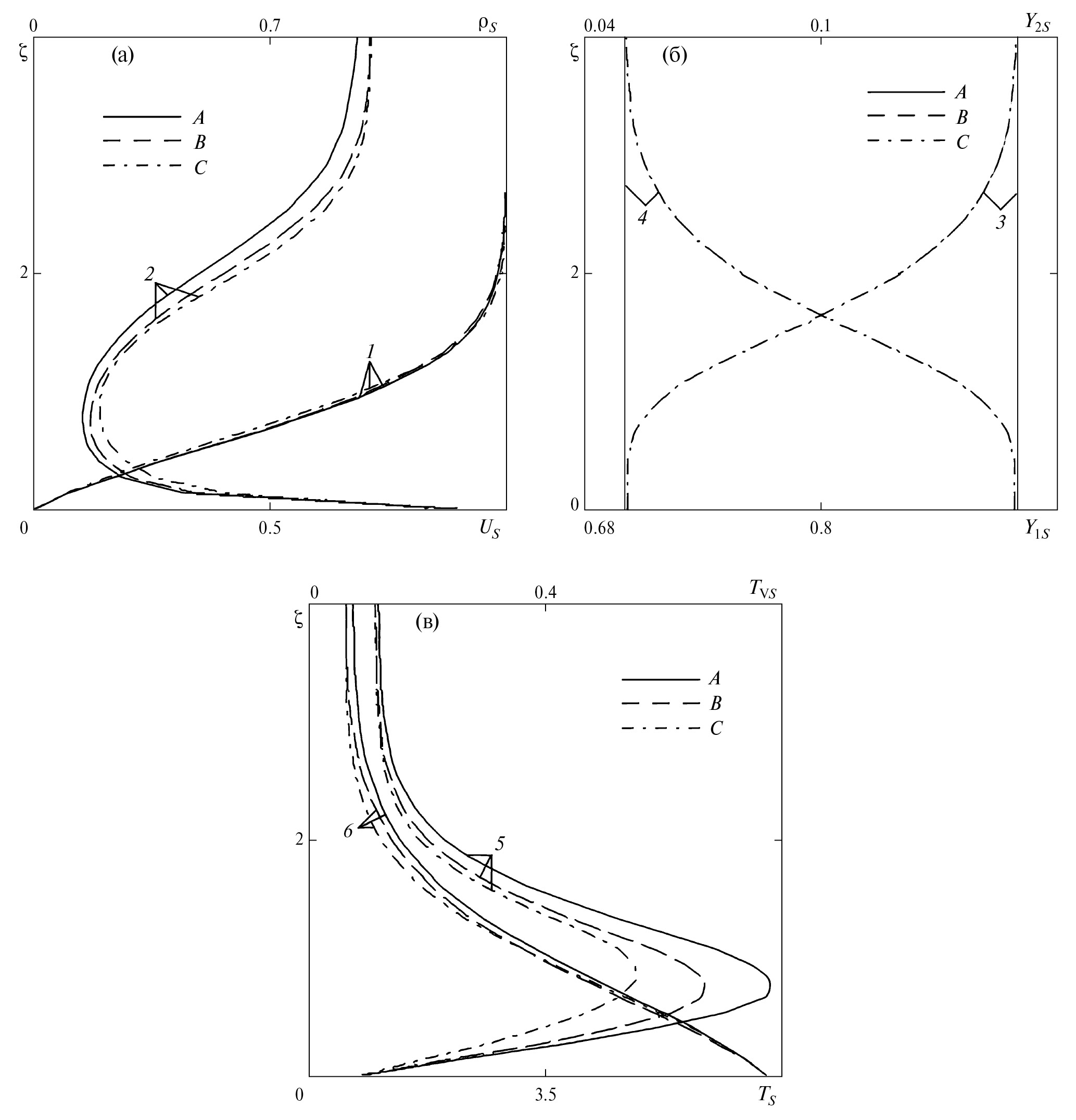 Рис. 1. Автомодельные профили скорости Us(ζ) (а) и плотности ρs(ζ) (а) смеси, массовых концентраций CO2 Y1s(ζ) (б) и CO Y2s(ζ) (б), статической Ts(ζ) (в) и колебательной Tvs(ζ) (в) температур для режима 1: 1 – зависимости Us(ζ); 2 – зависимости ρs(ζ); 3 – зависимости Y1s(ζ); 4 – зависимости Y2s(ζ); 5 – зависимости Ts(ζ); 6 – зависимости Tvs(ζ); A – совершенный газ (Dad= DaVT = 0); B – термически неравновесный газ (Dad = 0, DaVT = 5.32×10–3); C – термохимически неравновесный газ (Dad = 6.69×10–4, DaVT = 5.32×10–3).