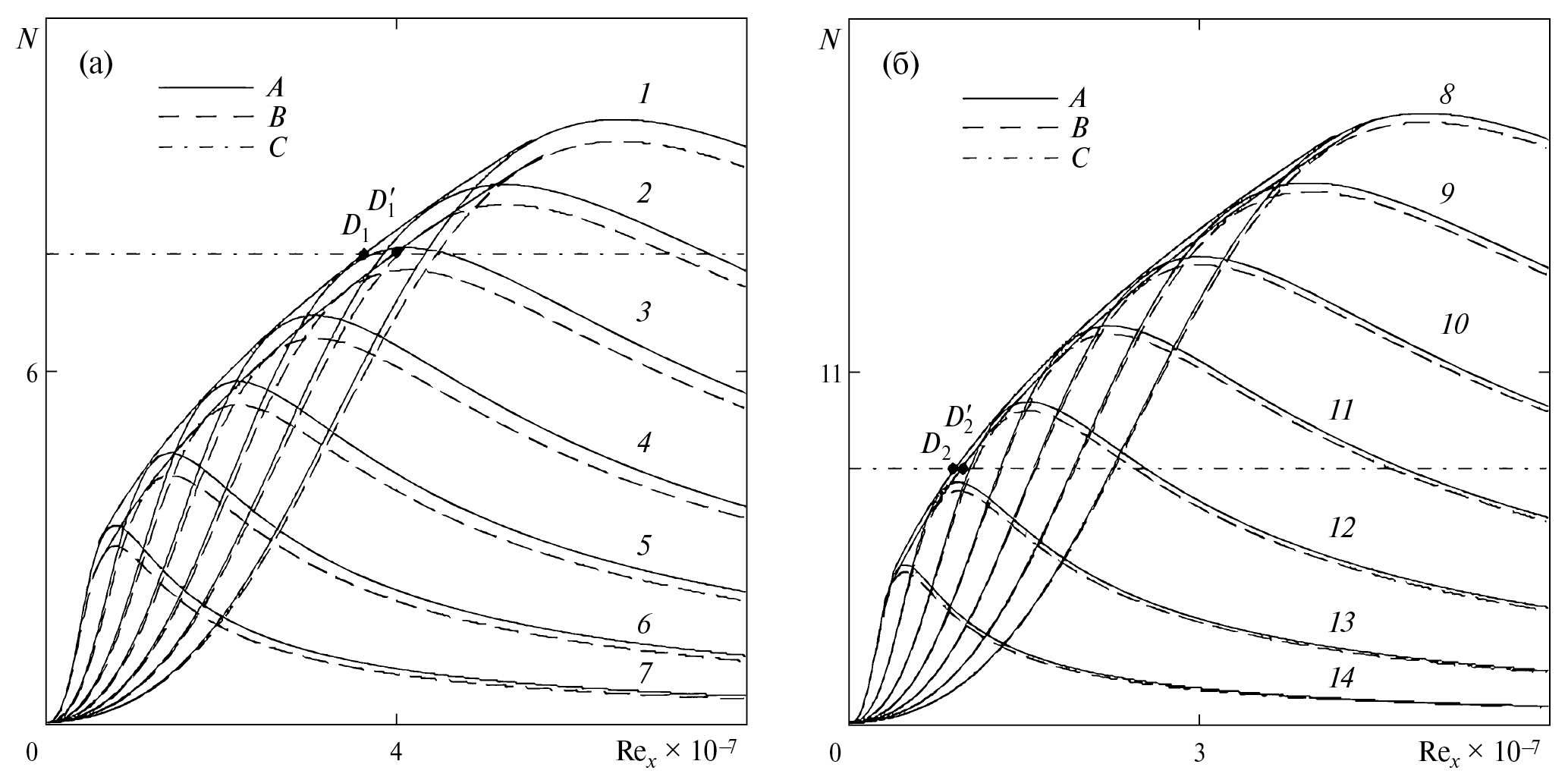 Рис. 3. Кривые N-факторов и положение ламинарно-турбулентного перехода: (а) – режим 1, ω = 4.25×10–4 (1), 4.375×10–4 (2), 4.5×10–4 (3), 4.625×10–4 (4), 4.75×10–4 (5), 4.875×10–4 (6), 5×10–4 (7); (б) – режим 2, ω = 9.25×10–4 (8), 9.375×10–4 (9), 9.5×10–4 (10), 9.625×10–4 (11), 9.75×10–4 (12), 9.875×10–4 (13), 10–3 (14); A – кривые N(Rex) для совершенного газа; B – кривые N(Rex) для термохимически неравновесного газа; C – прямая N = 8; D1 и D1′ – точки перехода для режима 1; D2 и D2′ – точки перехода для режима 2.
