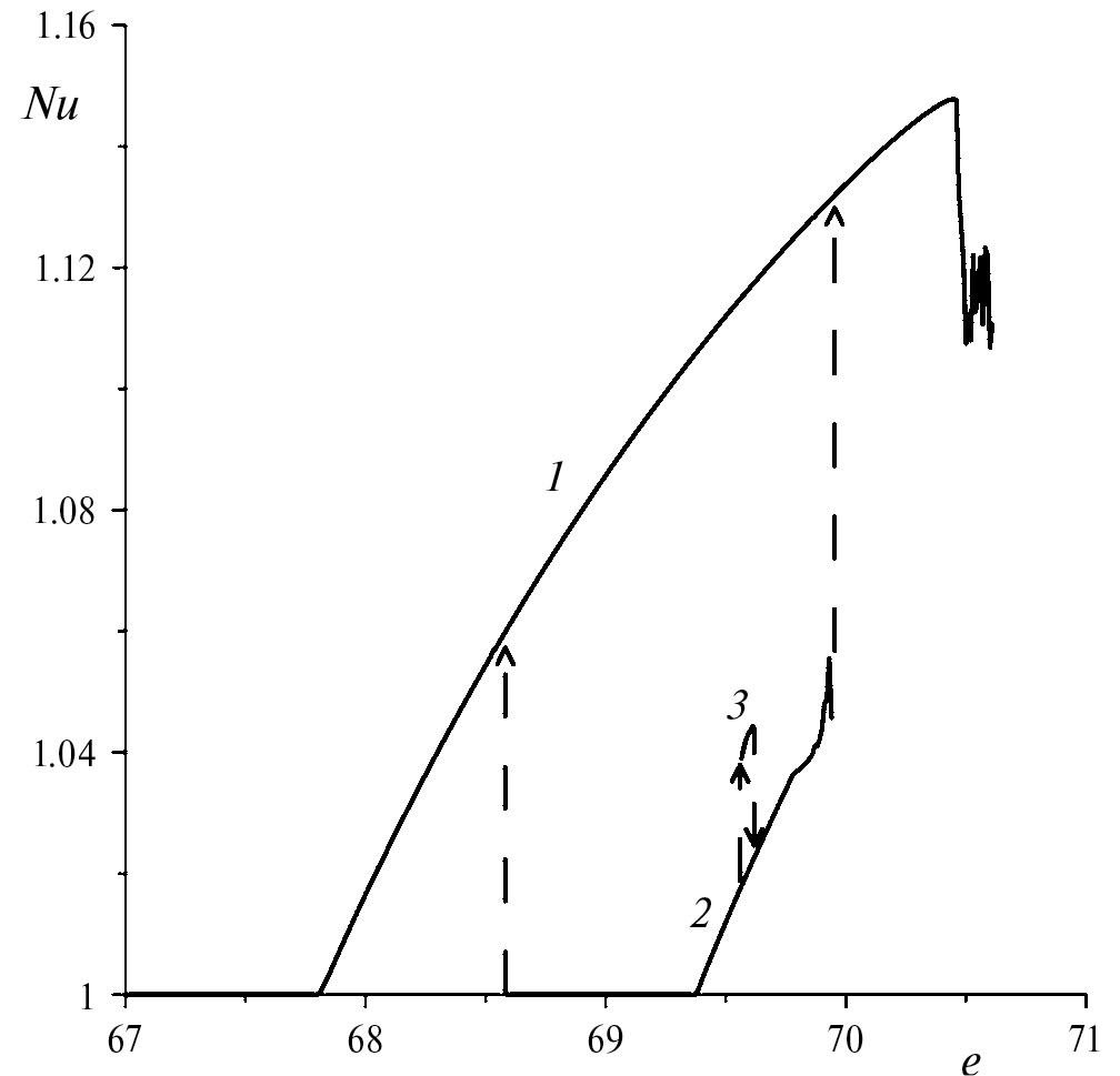 После расчетов методом продолжения по параметру было обнаружено более сложное поведение. Между тремя разными режимами поведения жидкости были обнаружены гистерезисные переходы. Эти гистерезисы видны на графике зависимости безразмерного теплопотока (числа Нуссельта) от нормированного электрического числа Рэлея (рис. 2). Оказалось, что синхронный режим 1 продолжает существовать при больших значениях параметра e. При e = 70.47 он переходит к хаосу через перемежаемость [11, 15].