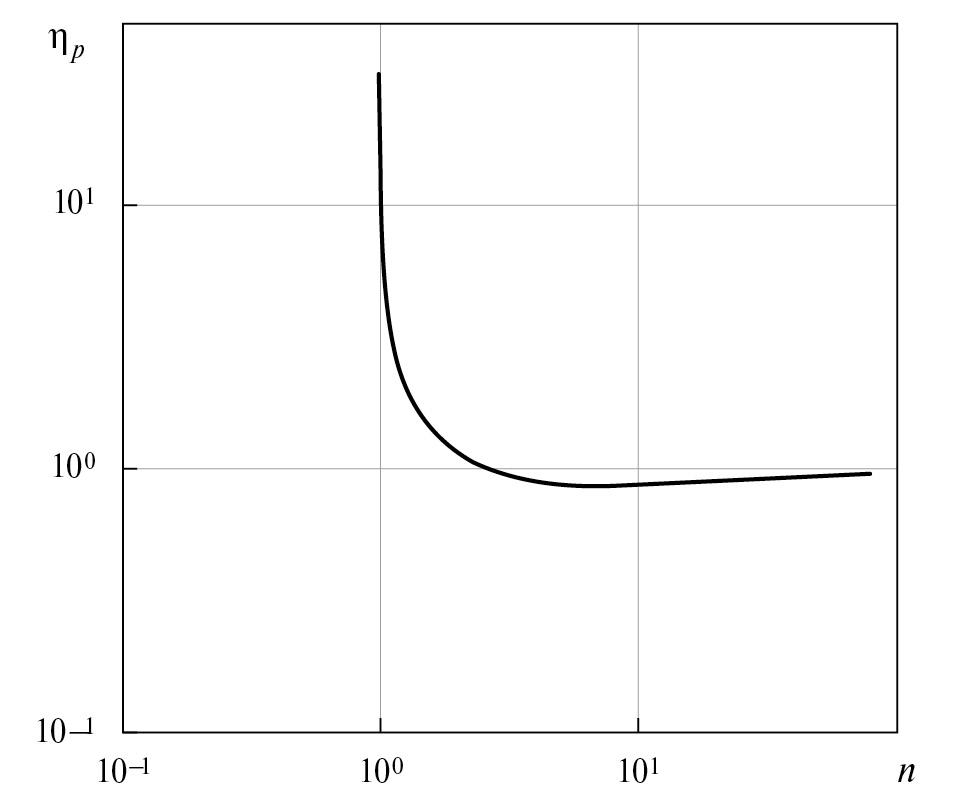 В этой связи решение уравнения (3.7) проводили численно. Результаты такого решения представлены на рис. 2 в виде графика зависимости ηp от n. Заметим, что при n ≈ 7.199 график функции ηp(n) имеет экстремум типа минимум. При этом значению n = 1 соответствует вертикальная асимптота.