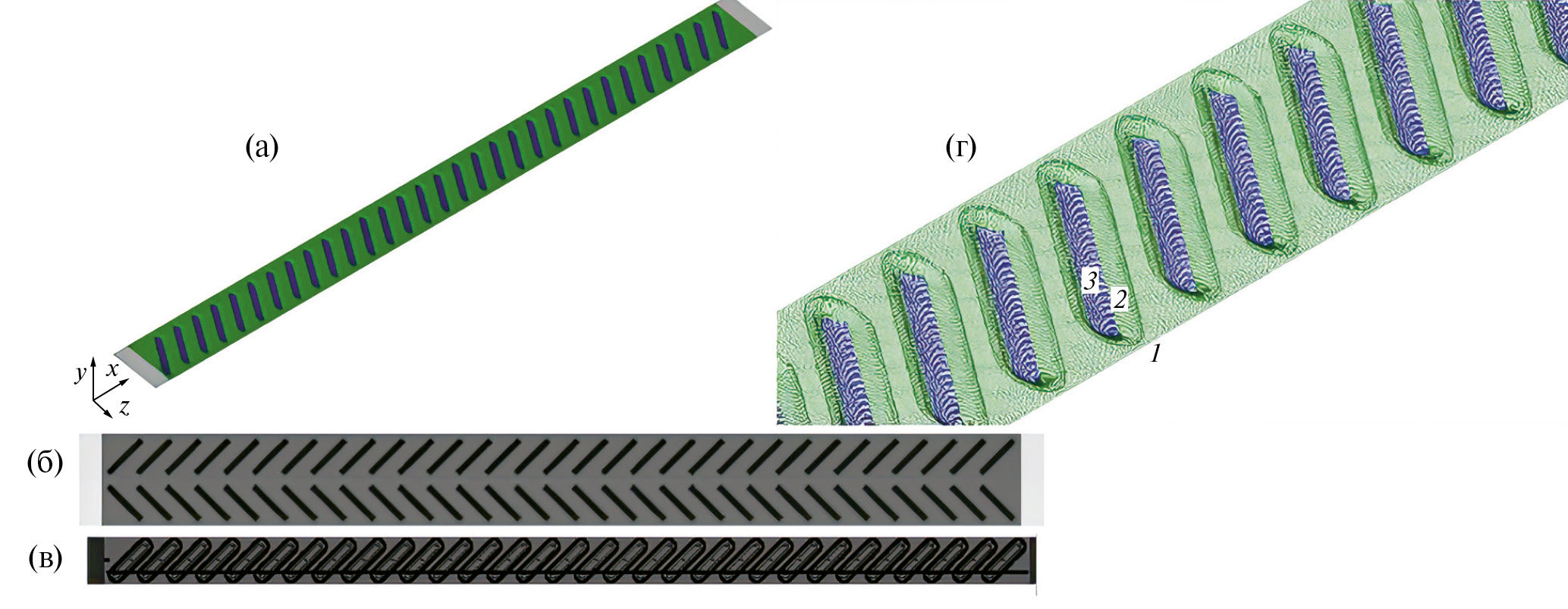 Рис. 1. Узкий канал с 31 наклонными канавками с системой декартовых координат x, y, z (а) и зигзагообразные коридорные пакеты канавок на стенке канала (б). Продольное сечение канавок в канале в серединах переходов от сферических сегментов к траншеям (в). Многоблочные расчетные сетки на структурированном участке стенки (г). 1 – подробная декартовая сетка, покрывающая канавки; 2 – криволинейная сетка О-типа в окрестности каждой канавки; 3 – косоугольная сетка-“заплатка”, наложенная на центральную зону канавки. Верхняя стенка канала не показана.
