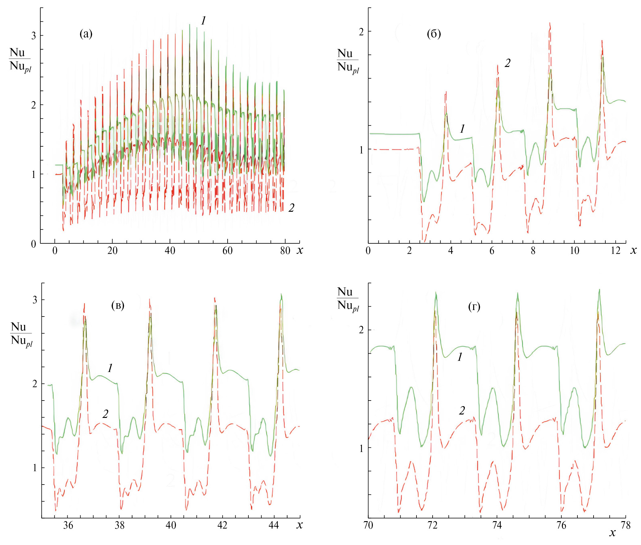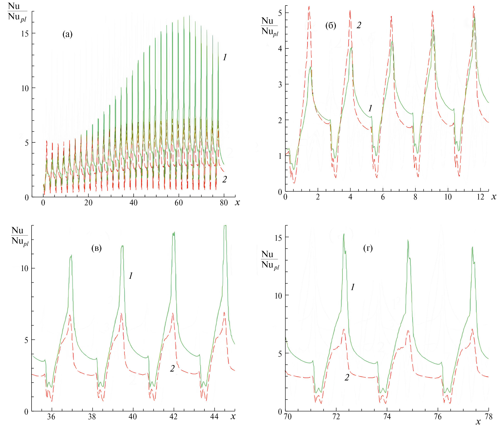 Максимумы и минимумы локальных осцилляций относительной теплоотдачи приходятся на проекции наклонных наветренных и подветренных кромок канавок на боковые грани канала. Они хорошо демонстрируются на укрупненных фрагментах зависимости Num/Numpl(x) для отмеченных участков нагретой стенки на рис. 4в–д.