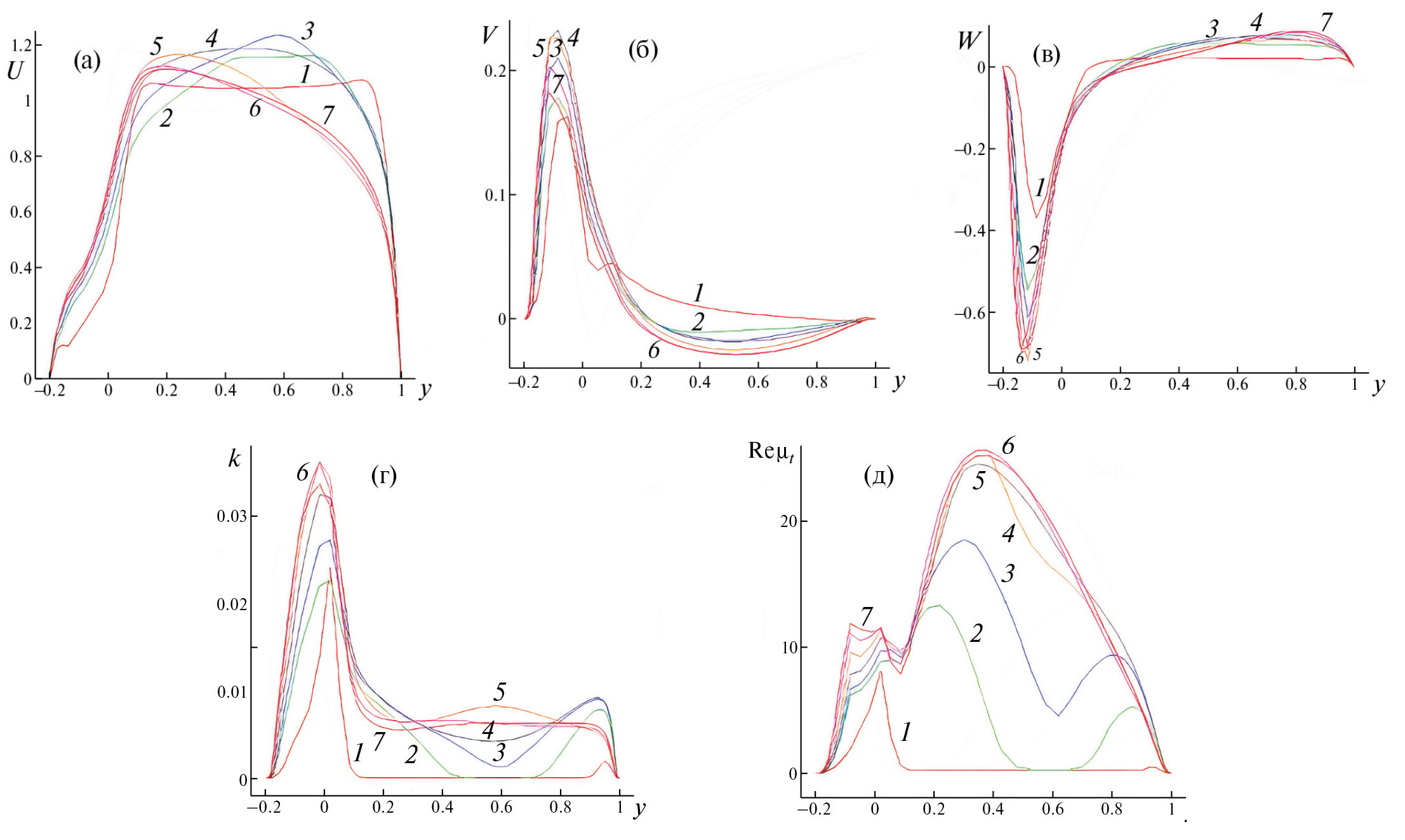 Рис. 15. Сравнение зависимостей от вертикальной координаты у декартовых составляющих скорости U (а, б), V (в), W (г), k (д), Reµt (е) в центрах сечений перехода от входных сферических сегментов к траншейных вставках выбранных канавок: 1 – 1-й; 2 – 5-й; 3 – 10-й; 4 – 15-й; 5 – 20-й; 6 – 25-й; 7 – 30-й. Графики на рис. 12б построены в крупном масштабе.