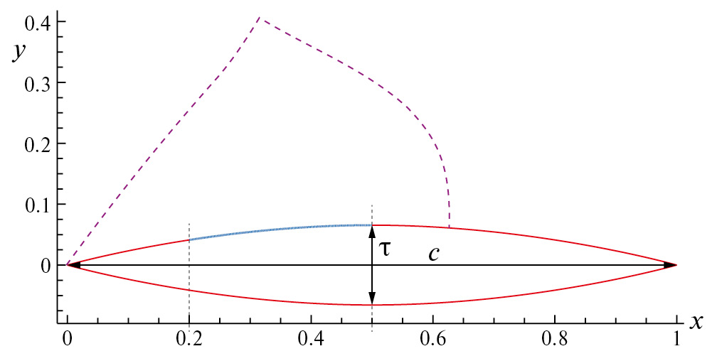 Рис. 1. Геометрия профиля крыла. Синим отмечено типовое положение области отсоса.