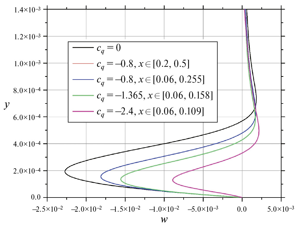 Отсос газа приводит к искажению профилей среднего течения. В качестве примера на рис. 3 представлены поля поперечной скорости w в пристенной области в сечении x = 0.1 для различных интенсивностей отсоса. Видно, что отсос пограничного слоя приводит к значительному ослабеванию поперечной компоненты скорости, что локально приводит к ослаблению нарастания неустойчивостей поперечного течения.