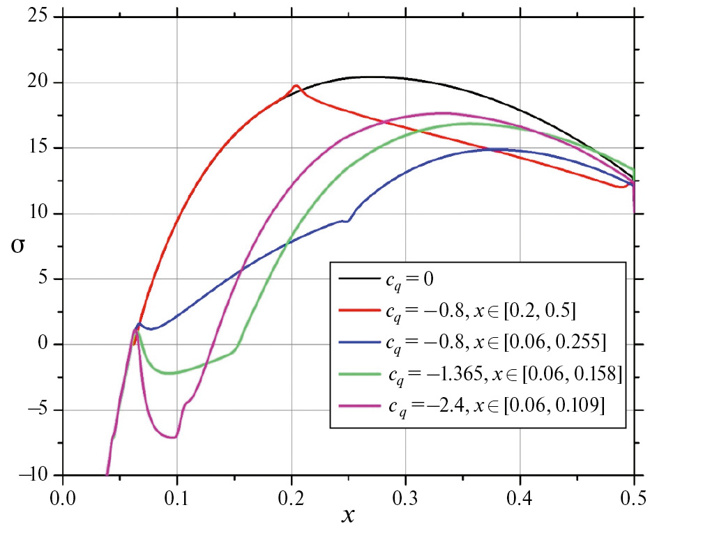 Отсос пограничного слоя через стенку моделируется на конечном участке, а интенсивность задается коэффициентом отсоса , где Отсосу газа из пограничного слоя внутрь стенки соответствуют отрицательные значения коэффициента cq. Отсос задается в области значения xs1, xs2 варьируют для разных расчетных случаев.
