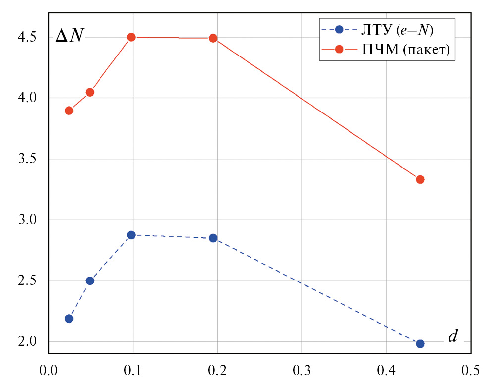 Видно, что максимальная эффективность отсоса пограничного слоя как для расчетов по eN-методу, так и для стационарного вихря неустойчивости поперечного течения при прямом численном моделировании реализуется при ширине области отсоса d = 0.1. Видно и то, что для волнового пакета при ПЧМ-расчете эффективность зоны отсоса оказывается выше, чем для расчета с помощью линейной теории устойчивости. Это связано с двумя факторами.