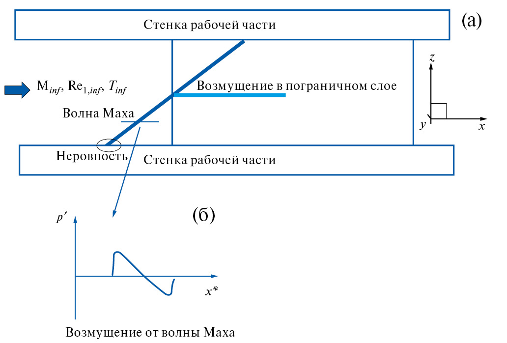 Одной из причин возникновения турбулентных клиньев могут являться возмущения от неровностей поверхности рабочей части АДТ, которые приводят к порождению пары слабых ударных волн в виде N-волн, распространяющихся в набегающем потоке (в некоторых работах их называют волнами Маха).