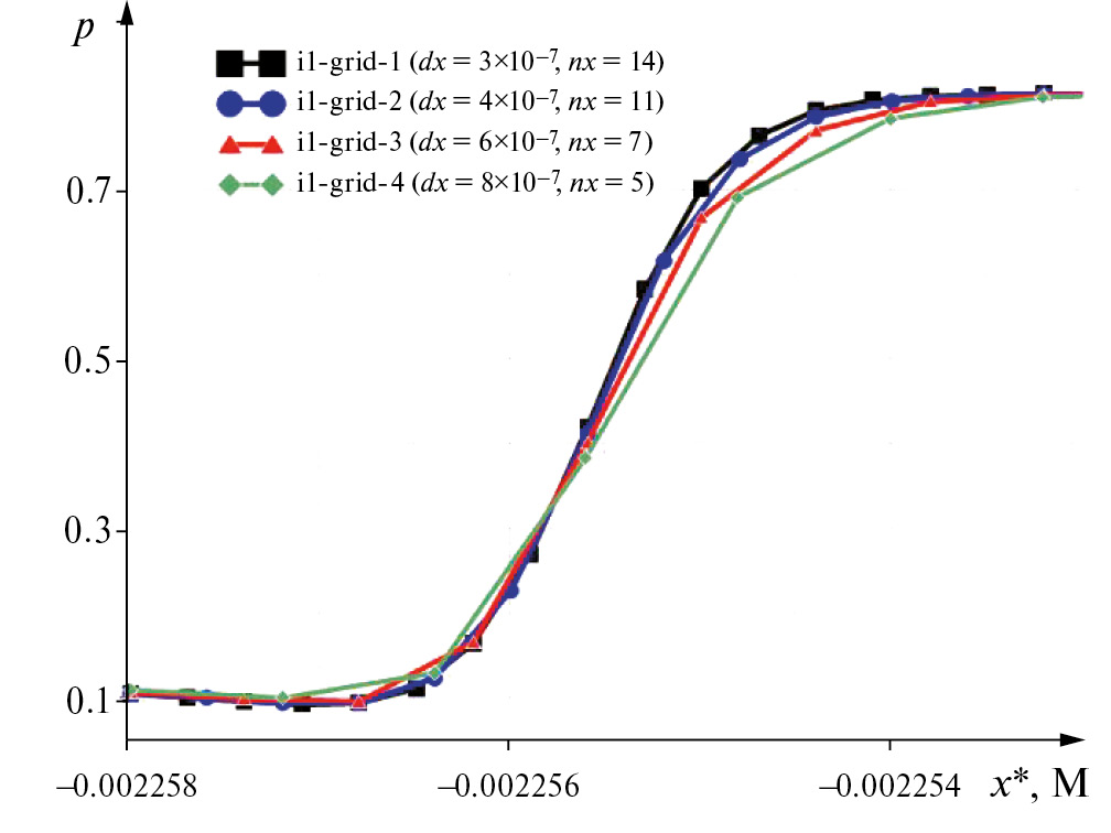 На рис. 5 показана структура ударной волны вдоль линии симметрии s1 (рис. 6а), полученная при решении уравнений Навье–Стокса. Толщина ударной волны, обусловленная конечными значениями вязкости и теплопроводности, составляет примерно 4 мкм. Данные рис. 5 свидетельствуют о сходимости расчетных данных на сетках с различным сгущением.