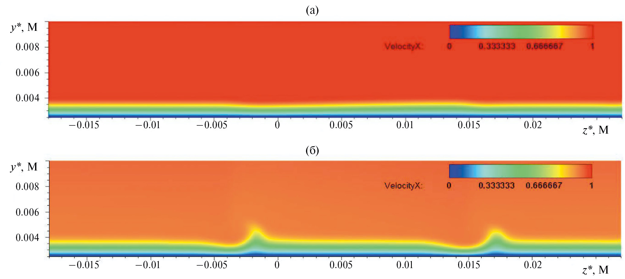 Рис. 12. Поле продольной компоненты скорости в сечении y* = 0.0029 м: острая (а) и затупленная (б) пластина.