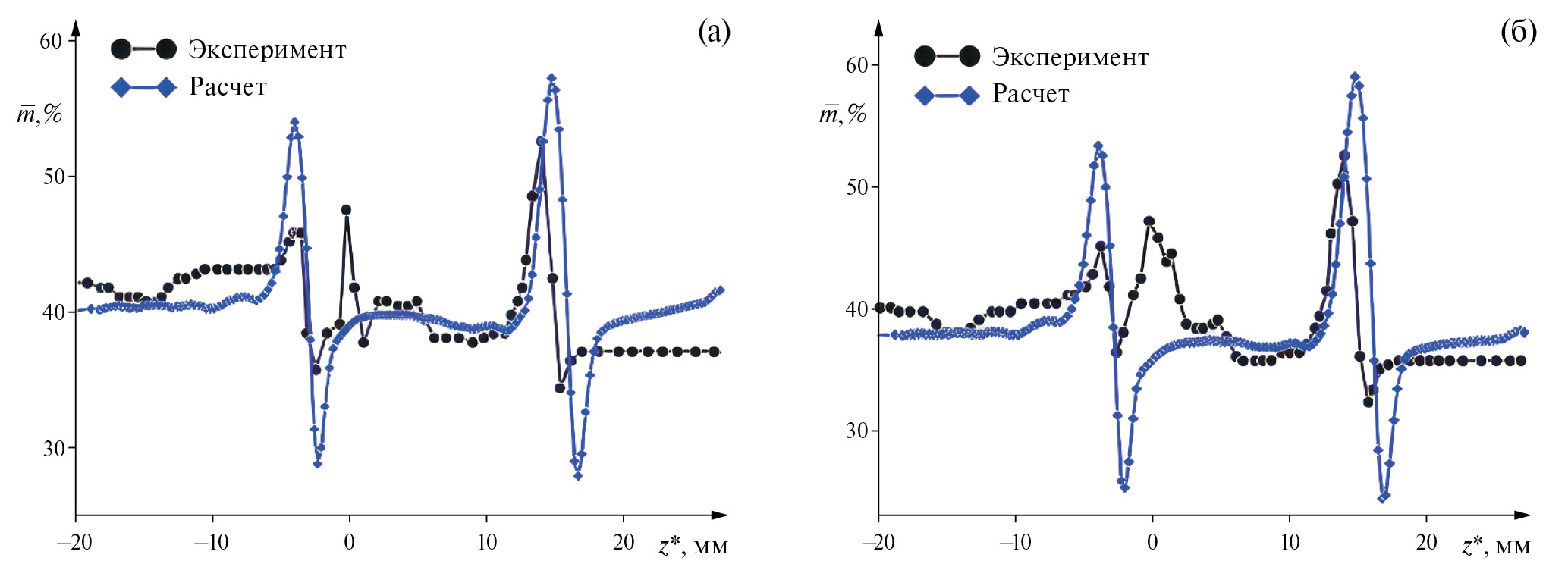 Рис. 15. Средние значения массового расхода: (а) – х* = 60 мм, у* ≈ 2.983 мм, (б) – х* = 90 мм, у* ≈ 3.079 мм.