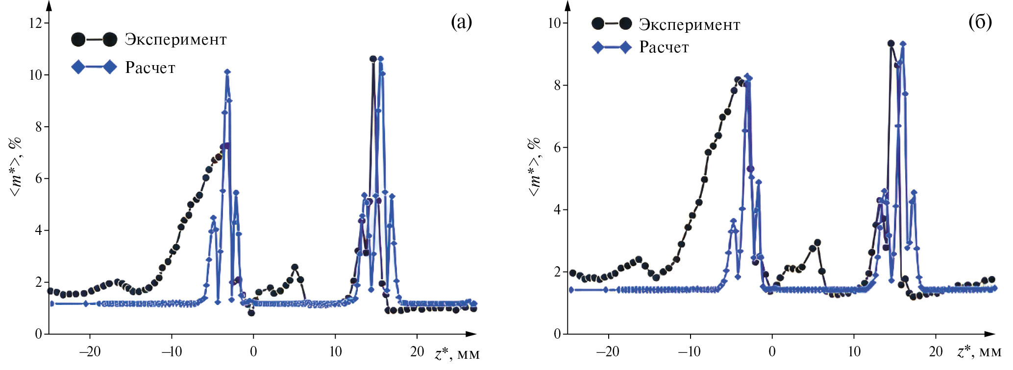 На рис. 15 средние значения массового расхода вдоль линии х* = 60 мм и х* = 90 мм сопоставлены с данными эксперимента. Соответствующее сопоставление для среднеквадратичного значения пульсаций массового расхода приведено на рис. 16. Из сопоставления следует, что результаты численного моделирования удовлетворительно согласуются с данными эксперимента. Это свидетельствует о корректности численного моделирования взаимодействия N-волны и затупленной пластины, обтекаемой сверхзвуковым потоком газа.
