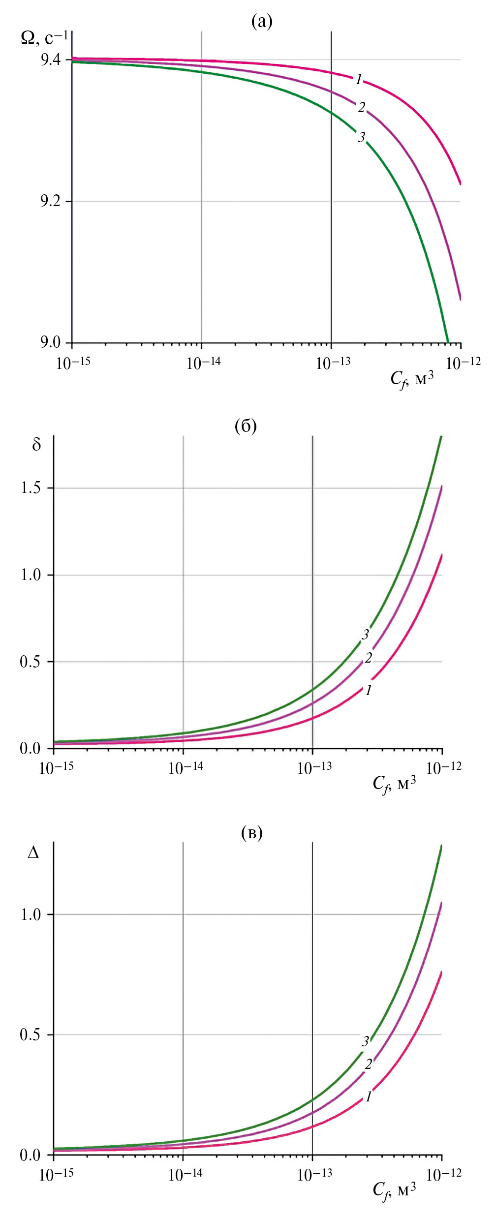 Рис. 2. Зависимости собственной частоты (а), коэффициента затухания (б) и декремента (в) от проводимости Cf трещины ГРП при числе трещин N = 10: 1–3 – kp = 10–15, 10–13, 10–12.