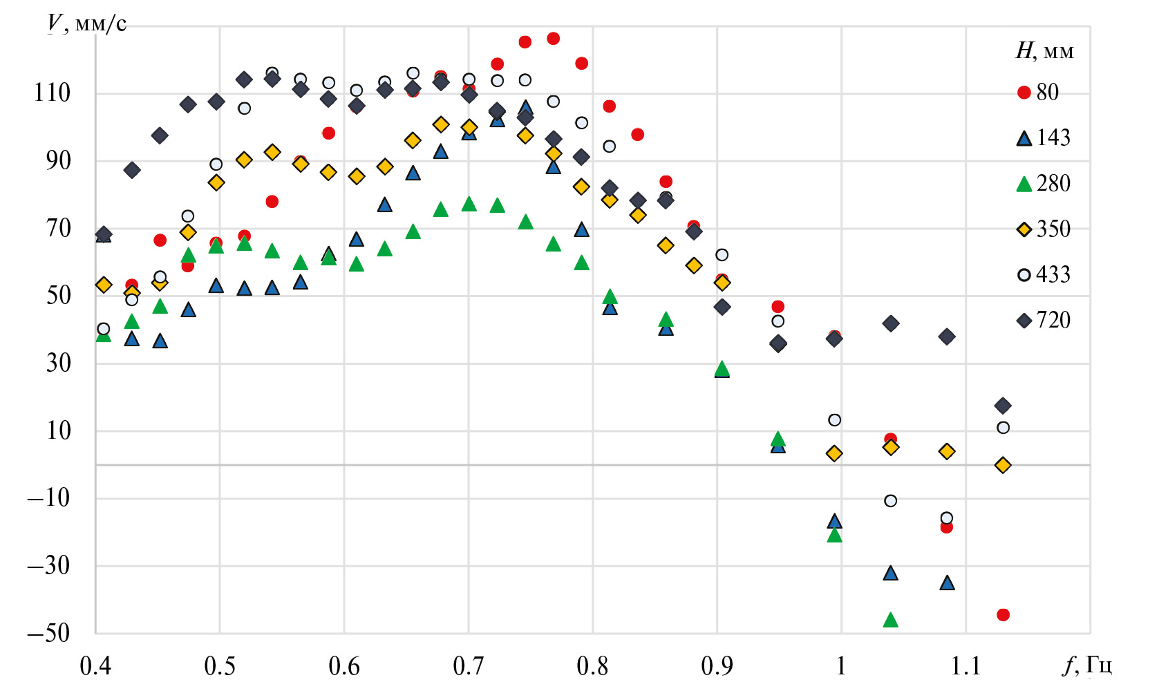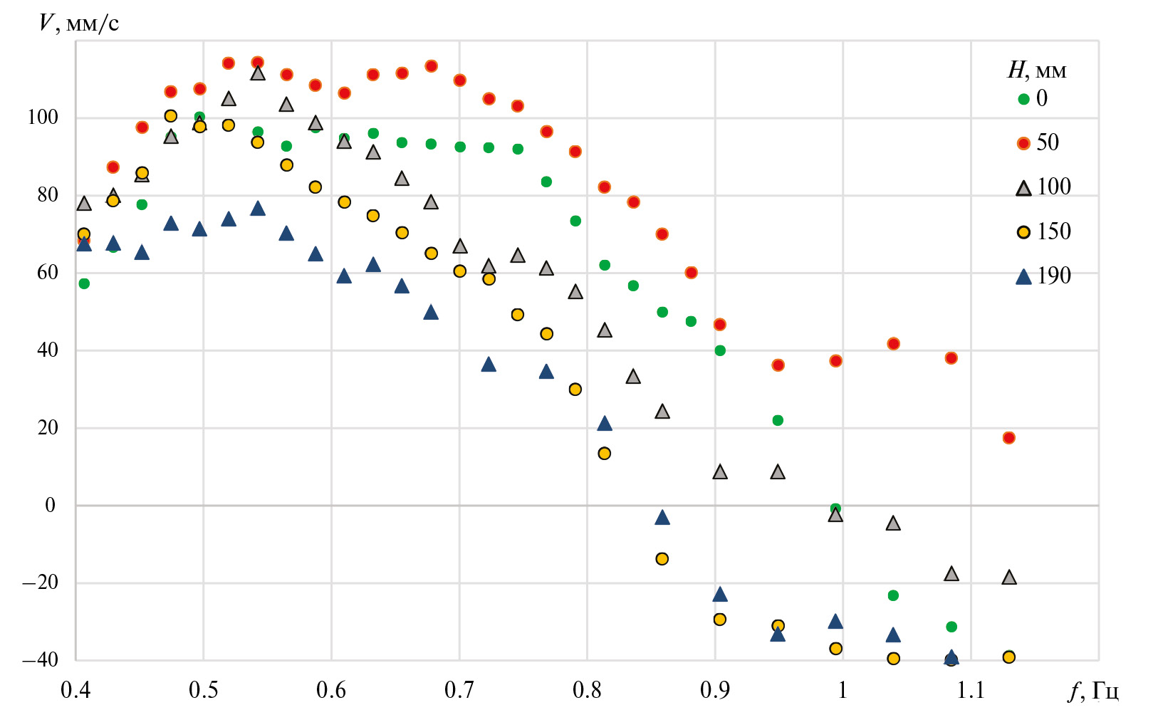 Рис. 4. Зависимость средней скорости от частот волн при осадке судна 720 мм при изменении глубины заглубления H движителя.