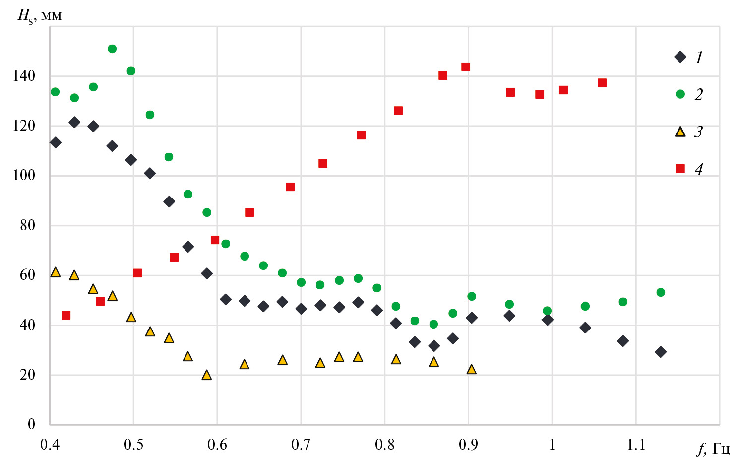 Рис. 5. Зависимость качки судна Hs от частот волн при осадке судна 710 мм. при изменении глубины погружения втулки крепления паруса H. Глубина погружения втулки 50, 0, 300 мм (1–3). 4 — высота волн при max амплитуде работы ВП.