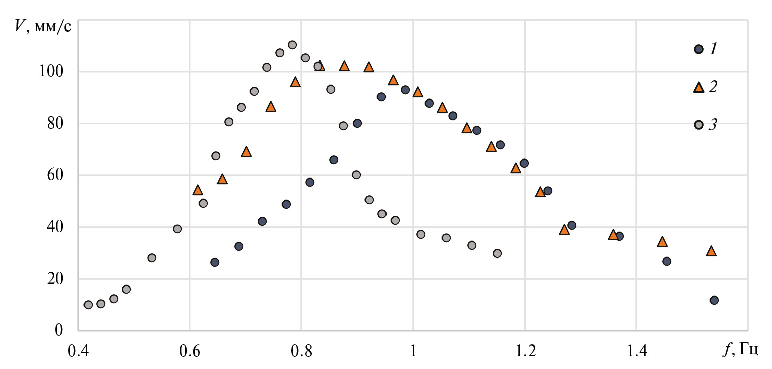 Рис. 9. Зависимости скорости от частоты волн при различной высоте волн. 1 — min, 2 — mid, 3 — max.