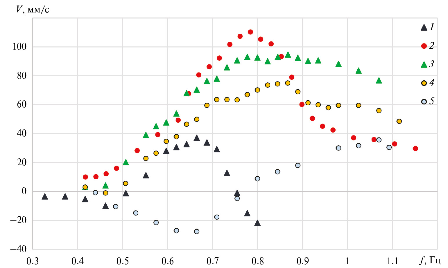 На рис. 12 представлены данные для скорости движения пластины против волн (режим работы ВП max), верхняя кромка которой установлена на нулевом уровне, а нижняя заглублена на 70 мм (такое заглубление соответствует примерно половине максимальной высоте волн и взаимодействие с подошвой волны здесь слабое). Измерения проведены для разных углов наклона: 20°, 30°, 45°, 60° (1–4). Видно, что положение максимумов скорости в зависимости от частоты для всех углов наклона примерно одинаково и почти совпадает с положением максимумов высоты волн (при крутизне 0.07 — штормовые волны). Величина максимумов скорости зависит от угла наклона пластины и наибольшие скорости судна против волн реализуются при углах наклона пластины в диапазоне 30°–45°.