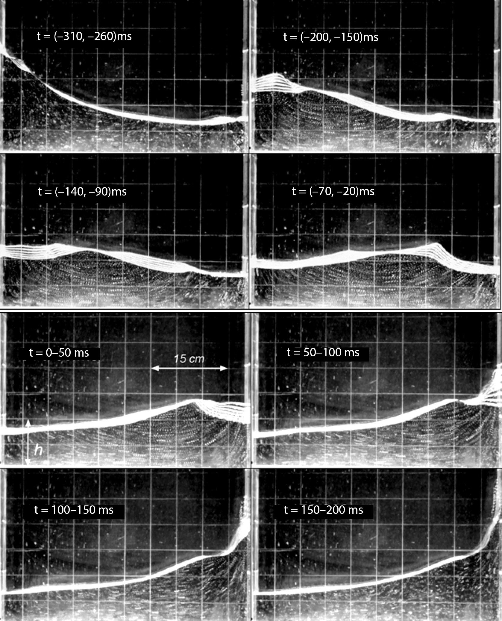На рис. 6 представлена последовательность снимков свободной поверхности в течение полупериода волны (частота кадров 1000 к/с). Каждый снимок получен путем наложения 50 видеокадров, но на снимке показан только каждый десятый волновой профиль. Таким образом, например, при t = (–200, –150) мс на снимке видны шесть волновых профилей, а треки формируются 6 точками.