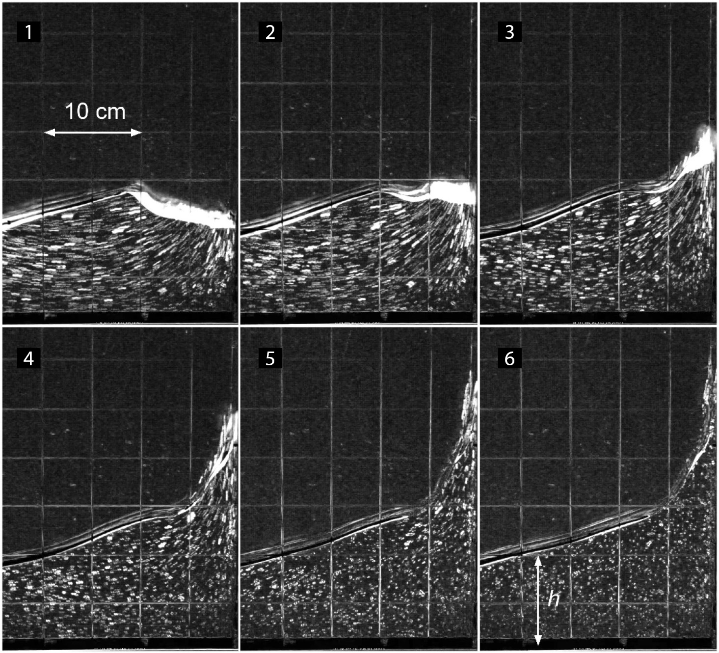 Приведенные на рис. 4 видеокадры описывают растущий гребень на интервале t = 0 — 240 мс от момента прохождения поверхностью воды невозмущенного уровня на правой стенке сосуда до вершины волны и полностью соответствуют рис. 3а. Треки частиц-трассеров на кадрах (2–5) показывают, что происходит своеобразная фокусировка жидкости в растущий гребень. Отметим практически нулевую длину треков на кадре 6, соответствующем максимальному развитию волны.