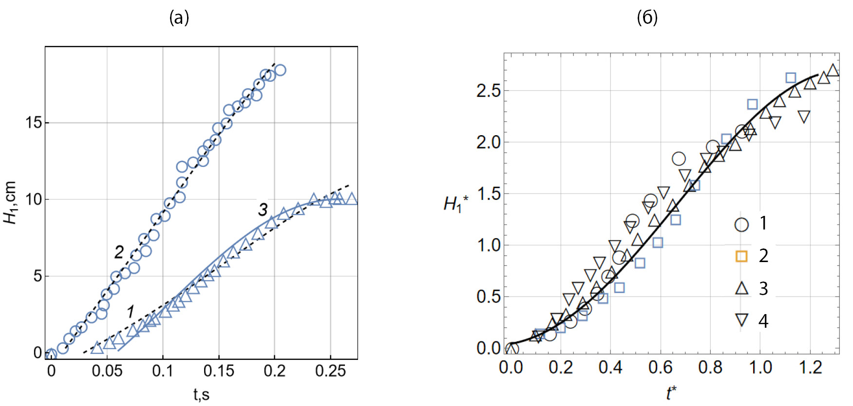 Рис. 9. а) Временная зависимость высоты струйного всплеска на боковой стенке для первой волновой моды: 1, 2 — T = 1.058, 1.026 с (период волны); 3 — расчет по (2.1); h = 10 см; s = 0.7 см; ω = 5.938 с–1 (по результатам видеосъемки со скоростью 1000 к/с); б) Временная зависимость высоты струйного всплеска в безразмерной форме H1* (t*): 1–4 — (h, s, Ω / 2, Hlim) = (5, 1.9, 4.88, 4), (7.5, 1.9, 5.51, 5.5), (10, 1.9, 5.72, 7), (10, 0.7, 6.12, 7).
