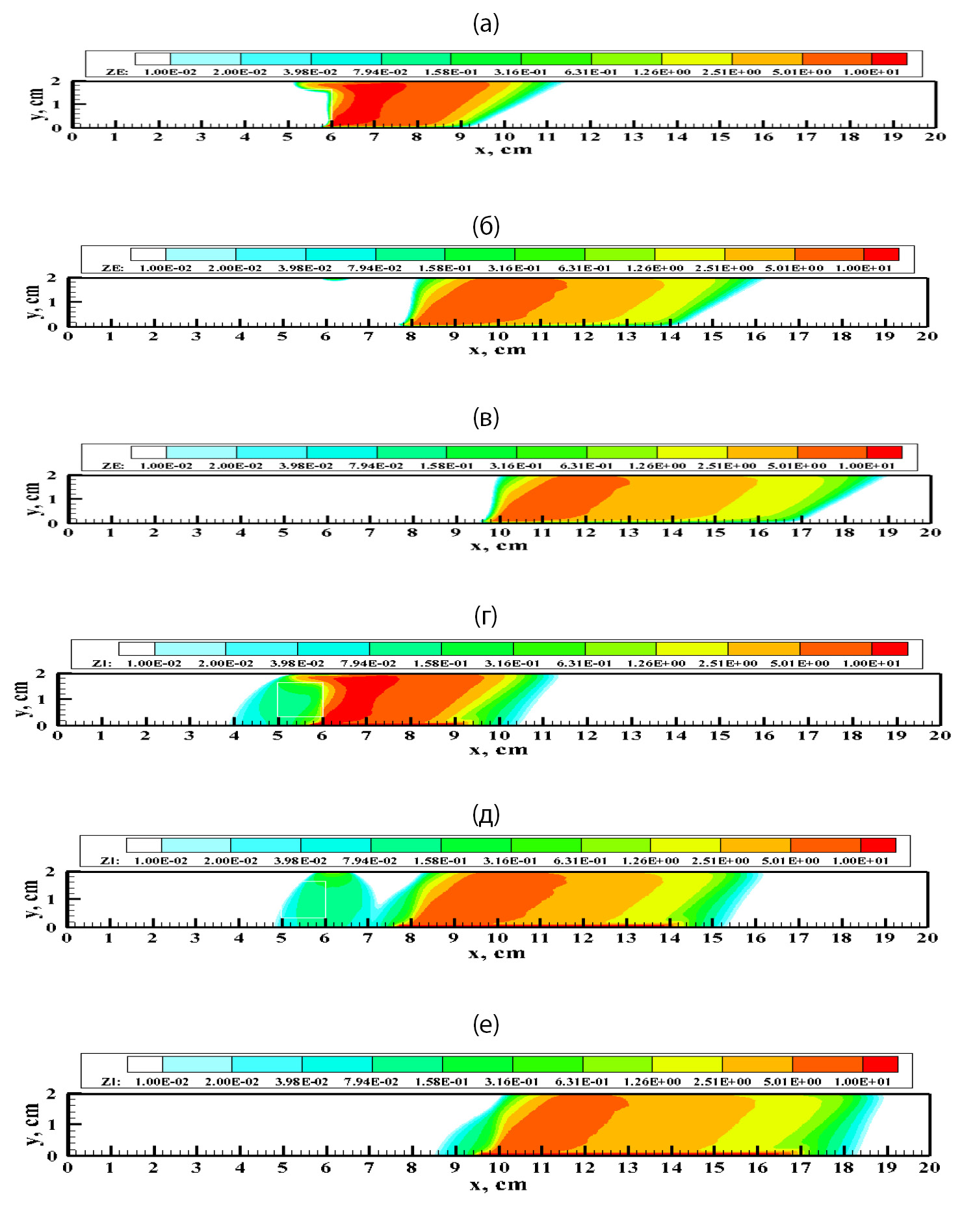 Заметим, что направление перемещения токового столба легко оценить с использованием электродинамического правила “левой руки” [10]. Вблизи нижней поверхности направление тока от анода к катоду (по определению — это ток ионов). Поэтому в магнитном поле с отрицательным направлением вектора индукции магнитного поля (против оси z) генерируемая в столбе магнитная сила направлена в положительном направлении оси x. С целью проверки симметрии конечно-разностных операторов в разработанном компьютерном коде аналогичные расчеты при Bz = +0.01 Tл подтвердили идентичность результатов при движении плазменного столба в отрицательном направлении оси x. Относительно характера перемещения тлеющего разряда отметим следующее. После включения магнитного поля наблюдается начальная фаза взаимодействия с ним токового столба газоразрядной плазмы. В тлеющем разряде наблюдаются колебания ионных и электронных концентраций. Этот эффект был отмечен в [8]. На рисунках 4а и 4г частично отражена эта фаза процесса. После завершения колебательного процесса токовый столб начинает двигаться примерно с постоянной скоростью в положительном направлении оси х. Примечательно, что на рисунке 4д видна фаза запаздывания дрейфа ионов к катоду (область повышенной концентрации ионов при 5 см ≤ x ≤ 7 см). Электроны, обладающие большей подвижностью, уже покинули эту область. По причине меньшей подвижности и коэффициентов диффузии ионов, при движении разряда вдоль поверхности область катодного слоя запаздывает по сравнению с анодным слоем. Распределения модуля напряженности электрического поля и скорости ионизационных процессов в последовательные моменты времени (рис. 5) показывает их локализацию вблизи катодной и анодной поверхностей.