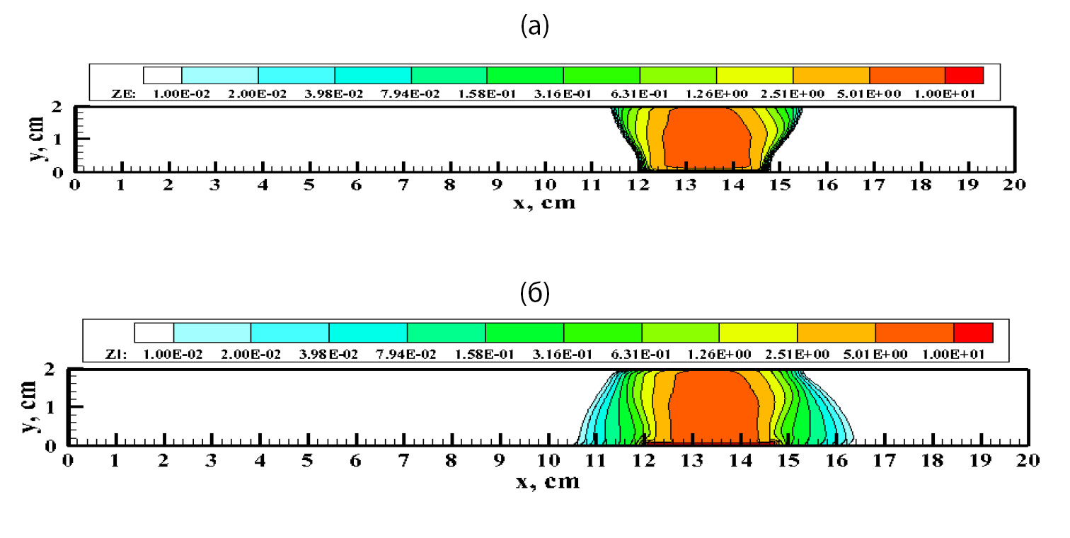 Последующая серия расчетов была посвящена изучению закономерностей движения тлеющего разряда без магнитного поля в газовых потоках при разных скоростях. До начала анализа полученных данных можно было бы предположить, что нормальный тлеющий разряд сносится потоком, поскольку вся нижняя и верхняя поверхности являются электродами, не имеющими границ, которые не могут ограничивать перемещения, как это наблюдается в аномальном тлеющем разряде [9]. Однако, конечно же, это не так, поскольку динамика токового столба в первую очередь определяется подвижностями заряженных частиц в электрическом поле и скоростью ионизационных процессов. То, что ионы имеют дрейфовые скорости, соизмеримые со скоростями движения нейтральных частиц несомненно оказывает влияние на перемещение токового столба, однако не является определяющим фактором. На рис. 6 и 7 показаны поля электронных и ионных концентраций в близкие моменты времени после начала движения при скорости потока М = 2 и М = 5 соответственно. Оценка скоростей перемещения токового столба вдоль канала дает U (M = 2) = 42 см/с и U (M = 5) = 400 см/с. Отметим хорошее сохранение токового столба при постепенном увеличении его поперечных размеров.