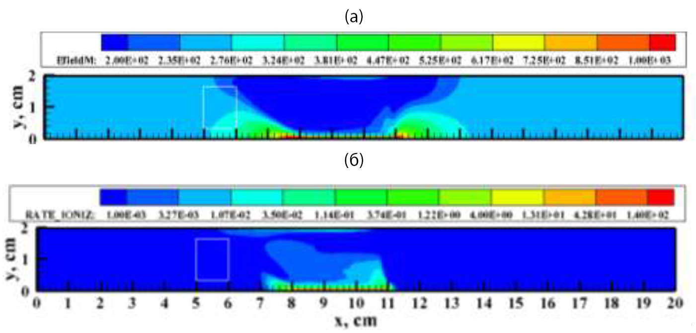 Вблизи верхней поверхности канала локализован анодный слой отрицательного объемного заряда. На самой поверхности концентрация ионов стремится к нулю. Положение токового столба тлеющего разряда хорошо идентифицируется по распределению электрического потенциала на рис. 2в. Хорошо видно, что наибольший градиент электрического потенциала сосредоточен в катодном слое, где формируется область наибольших значений напряженности электрического поля (рис. 2г). Следствием такой локализации напряженности является локализация областей наибольшей скорости ионизационных процессов: в наибольшей степени вблизи катодного слоя и значительно меньше — у анодного слоя (рис.2д).