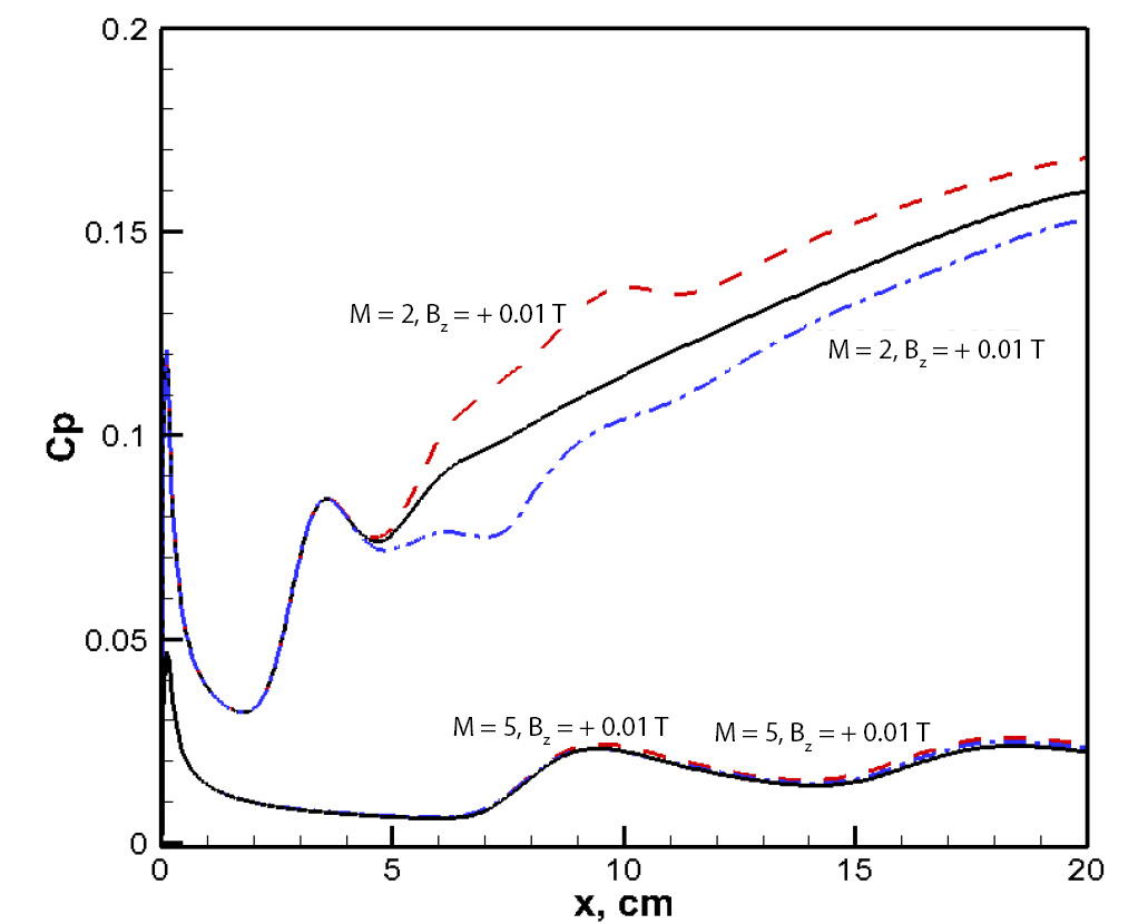 Рис. 16. Распределение коэффициента давления вдоль нижней поверхности при М = 2 и М = 5. Сплошные кривые — Bz = –0.01 Тл, штриховые кривые — Bz = +0.01 Тл; сплошная кривая — распределение коэффициента давления без разряда.