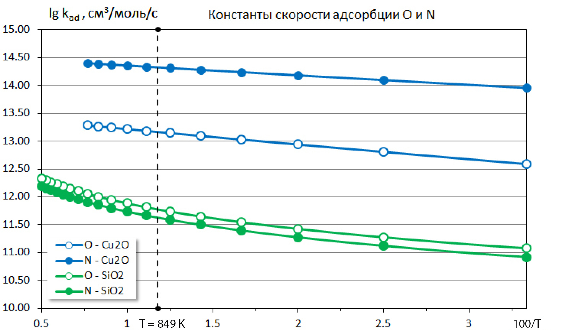 Рис. 2. Зависимость коэффициента скорости адсорбции kad атомов азота и кислорода на поверхностях Cu2O и SiO2 от температуры поверхности.