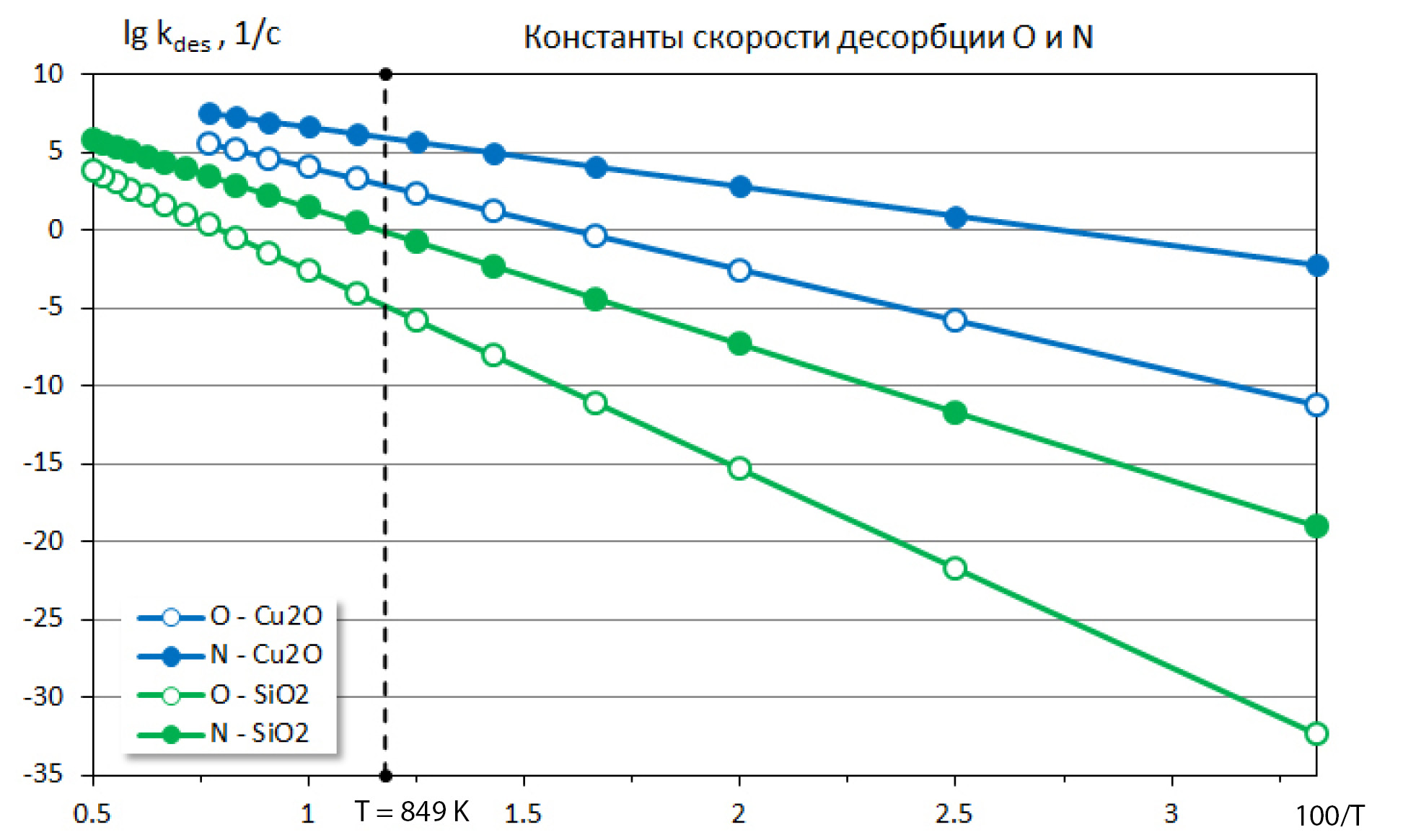 Рис. 3. Зависимость коэффициента скорости десорбции kdes атомов азота и кислорода на поверхности Cu2O и SiO2 от температуры поверхности.