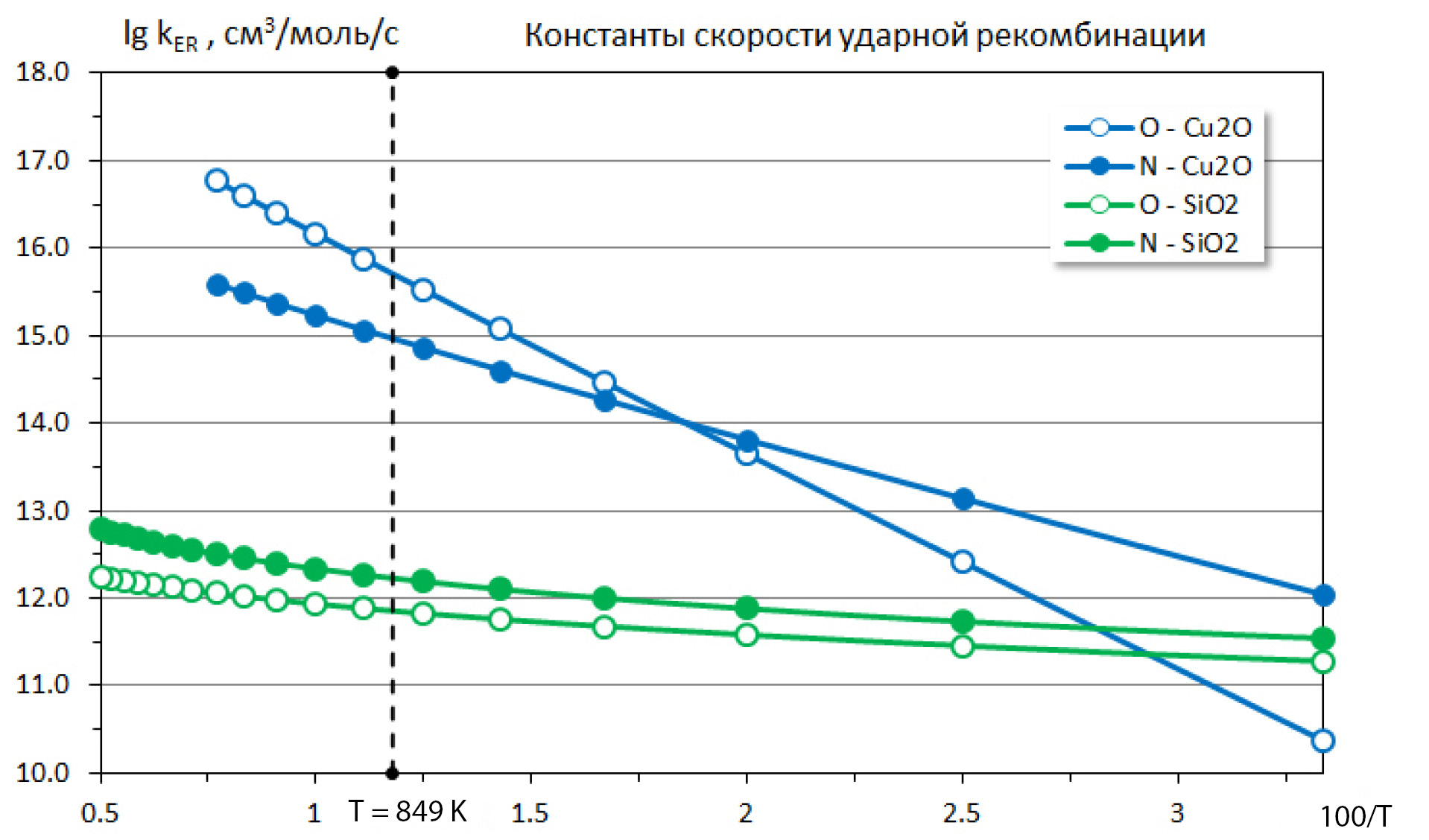 На рис. 2–4 приведено сравнение констант скоростей реакций адсорбции, десорбции и ударной рекомбинации для рассматриваемых материалов. Вертикальная пунктирная линия на рисунках ниже соответствует температуре поверхности в эксперименте T = 849 K. Отметим, что константы скорости адсорбции азота и кислорода для SiO2 близки друг к другу, а константы скорости адсорбции кислорода и азота на меди превосходят соответствующие величины для кремния на соответственно полтора и два с половиной порядка. Константы скорости десорбции атомов азота и кислорода на меди на 6–8 порядков больше, чем аналогичные значения для β-кристобалита. На поверхности β-кристобалита константа скорости десорбции азота на 5 порядков выше, чем для кислорода, в то время как константы скорости адсорбции практически совпадают. Для меди константы скорости адсорбции и десорбции азота существенно выше аналогичных значений для кислорода. Константы скорости ударной рекомбинации на меди на 2–3 порядка превосходит константы скорости рекомбинации на кварце. Константа скорости рекомбинации кислорода на меди превосходит константу скорости рекомбинации азота, а на кремнии азот рекомбинирует более интенсивно чем кислород.