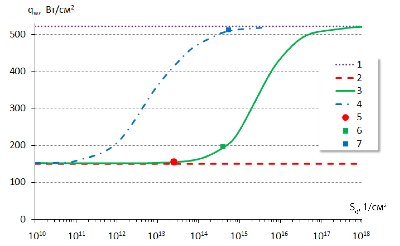 Рис. 5. Тепловой поток к поверхности датчиков SiO2 и Cu2O в зависимости от плотности мест адсорбции S0: 1 — идеально каталитическая поверхность, 2 — некаталитическая поверхность, 3 — SiO2, 4 — Cu2O, 5 — SiO2 эксперимент, 6 — SiO2 S0*, 7 — Cu2O S0*.