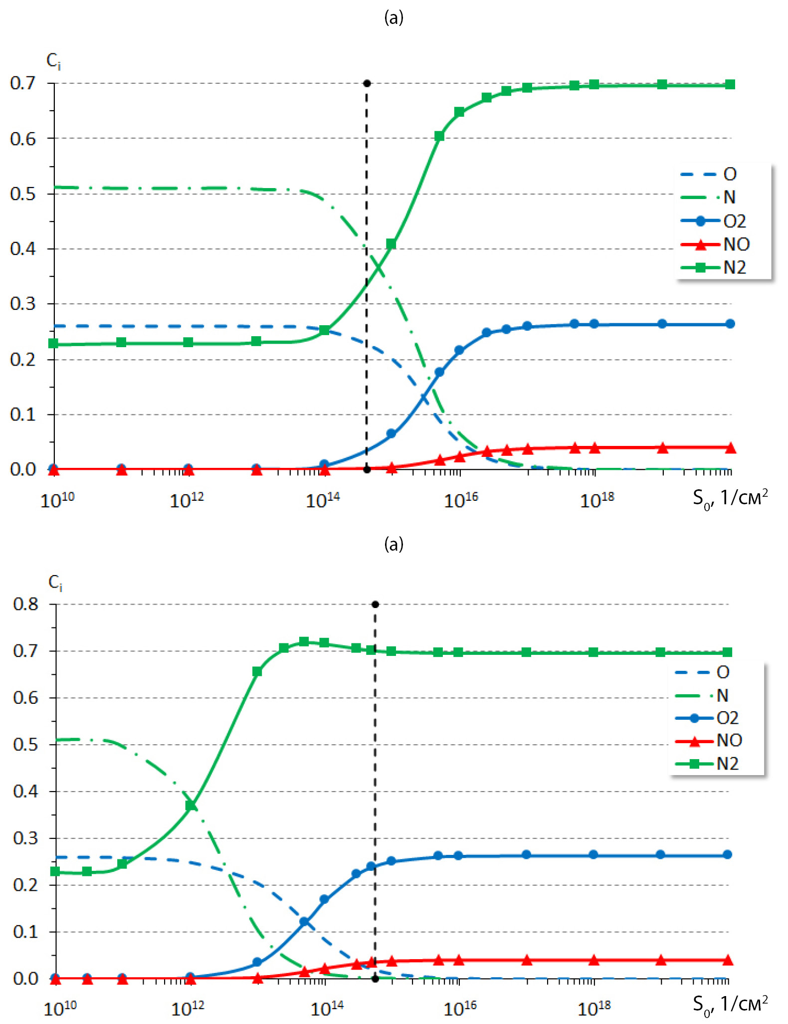 Приведенные выражения для степеней заполнения слабо зависят от газофазных концентраций yO, yN, когда они далеки от нулевых значений. При выходе на идеально каталитический режим, когда все атомы, достигающие поверхности, рекомбинируют на ней (yO = yN = 0), степени заполнения θO, θN становятся равными нулю. Однако для характерных точек рассматриваемого диапазона параметра S0 в наших расчетах газофазные концентрации имеют следующие значения (моль/см3)